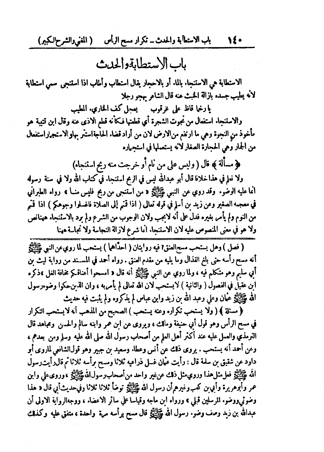 رواه أحمد في المسند من رواية ليث بن أبي سليم وهو متكلم فيه، ولما روي عن النبي صلى الله عليه وسلم أنه قال " امسحوا أعناقكم مخافة الغل " ذكره ابن عقيل في الفصول (والثانية) لا يستحب لأن الله تعالى لم يأمر به، وإن الذين حكوا وضوء رسول الله صلى الله عليه وسلم عثمان وعلي وعبد الله بن زيد وابن عباس لم يذكروه ولم يثبت فيه حديث (مسألة) (ولا يستحب تكراره وعنه يستحب) الصحيح من المذهب أنه لا يستحب التكرار في مسح الرأس وهو قول أبي حنيفة ومالك، ويروى عن ابن عمر وابنه سالم والحسن ومجاهد قال