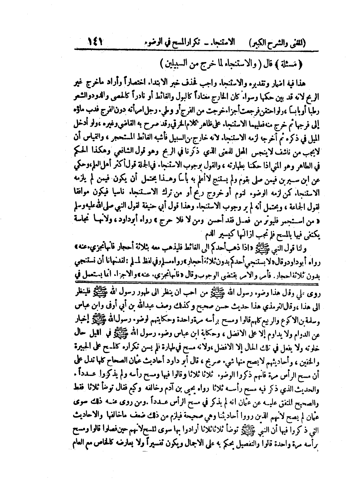 روى علي وقال هذا وضوء رسول الله صلى الله عليه وسلم من أحب أن ينظر إلى طهور رسول الله صلى الله عليه وسلم فلينظر إلى هذا، وقال الترمذي هذا حديث حسن صحيح وكذلك وصف عبد الله بن أبي أوفى وابن عباس وسلمة بن الاكوع والربيع كلهم قالوا ومسح برأسه مرة واحدة وحكايتهم لوضوء رسول الله صلى الله عليه وسلم إخبار عن الدوام ولا يداوم إلا على الأفضل، وحكاية ابن عباس وضوء رسول الله صلى الله عليه وسلم في الليل حال خلوته ولا يفعل في تلك الحال إلا الأفضل، ولأنه مسح في طهارة فلم يسن تكراره كالمسح على الجبيرة والخفين، وأحاديثهم لا يصح منها شئ صريح، قال أبو داود أحاديث عثمان الصحاح كلها تدل على أن مسح الرأس مرة فإنهم ذكروا الوضوء ثلاثا ثلاثا وقالوا فيها ومسح رأسه ولم يذكروا عددا والحديث الذي ذكر فيه مسح رأسه ثلاثا رواه يحيى بن آدم وخالفه وكيع فقال توضأ ثلاثا فقط والصحيح المتفق عليه عن عثمان أنه لم يذكر في مسح الرأس عددا.