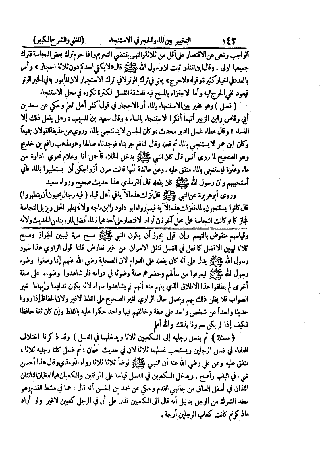ثلاثا ليبين الأفضل كما فعل في الغسل فنقل الأمران من غير تعارض قلنا قول الراوي هذا طهور رسول الله صلى الله عليه وسلم يدل على أنه كان يفعله على الدوام لأن الصحابة رضي الله عنهم إنما وصفوا وضوء رسول الله صلى الله عليه وسلم ليعرفوا من سألهم وحضرهم صفة وضوئه في دوامه فلو شاهدوا وضوءه على صفة أخرى لم يطلقوا هذا الإطلاق الذي يفهم منه أنهم لم يشاهدوا سواه لأنه يكون تدليسا وإيهاما لغير الصواب فلا يظن ذلك بهم ويحمل حال الراوي لغير الصحيح على الغلط لاغير ولأن الحفاظ إذا رووا حديثا واحدا عن شخص واحد على صفة وخالفهم فيها واحد حكموا عليه بالغلط وإن كان ثقة حافظا فكيف إذا لم يكن معروفا بذلك والله أعلم (مسألة) ثم يغسل رجليه إلى الكعبين ثلاثا ويدخلهما في الغسل) وقد ذكرنا اختلاف العلماء في غسل الرجلين ويستحب غسلهما ثلاثا لأن في حديث عثمان: ثم غسل كلتا رجليه ثلاثاً، متفق عليه وعن علي رضي الله عنه أن النبي صلى الله عليه وسلم توضأ ثلاثا ثلاثا رواه الترمذي وقال هذا أحسن شئ في الباب وأصح.