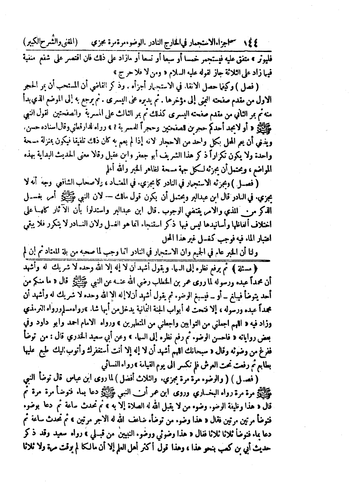 (مسألة) ثم يرفع نظره إلى السماء ويقول أشهد ان لا إله إلا الله وحده لا شريك له وأشهد أن محمداً عبده ورسوله لما روى عمر بن الخطاب رضي الله عنه عن النبي صلى الله عليه وسلم قال " ما منكم من أحد يتوضأ فيبلغ - أو - فيسبغ الوضوء ثم يقول أشهد أن لا إله إلا الله وحده لا شريك له وأشهد أن محمداً عبده ورسوله، إلا فتحت له أبواب الجنة الثمانية يدخل من أيها شاء " رواه مسلم ورواه الترمذي وزاد فيه " اللهم اجعلني من التوابين واجعلني من المتطهرين " ورواه الإمام أحمد وابو داود وفي بعض رواياته " فأحسن الوضوء ثم رفع نظره إلى السماء " وعن أبي سعيد الخدري قال: من توضأ ففرغ من وضوئه وقال " سبحانك اللهم أشهد ان لا إله إلا أنت أستغفرك وأتوب إليك طبع عليها بطابع ثم رفعت تحت العرش فلم تكسر إلى يوم القيامة " رواه النسائي (فصل) (والوضوء مرة مرة يجزئ والثلاث أفضل) لما روى ابن عباس قال توضأ النبي صلى الله عليه وسلم مره مرة رواه البخاري وروي ابن عمر أن النبي صلى الله عليه وسلم دعا بماء فتوضأ مرة مرة ثم قال " هذا وظيفة الوضوء وضوء من لا يقبل الله له الصلاة إلا به " ثم تحدث ساعة ثم دعا بوضوء فتوضأ مرتين مرتين فقال " هذا وضوء من توضأه ضاعف الله له الأجر مرتين " ثم تحدث ساعة ثم دعا بماء فتوضأ ثلاثا ثلاثا فقال " هذا وضوئي ووضوء النبيين من قبلي " رواه سعيد وقد ذكر حديث أبي بن كعب بنحو هذا، وهذا قول أكثر أهل العلم إلا أن مالكاً لم يوقت مرة ولا ثلاثا