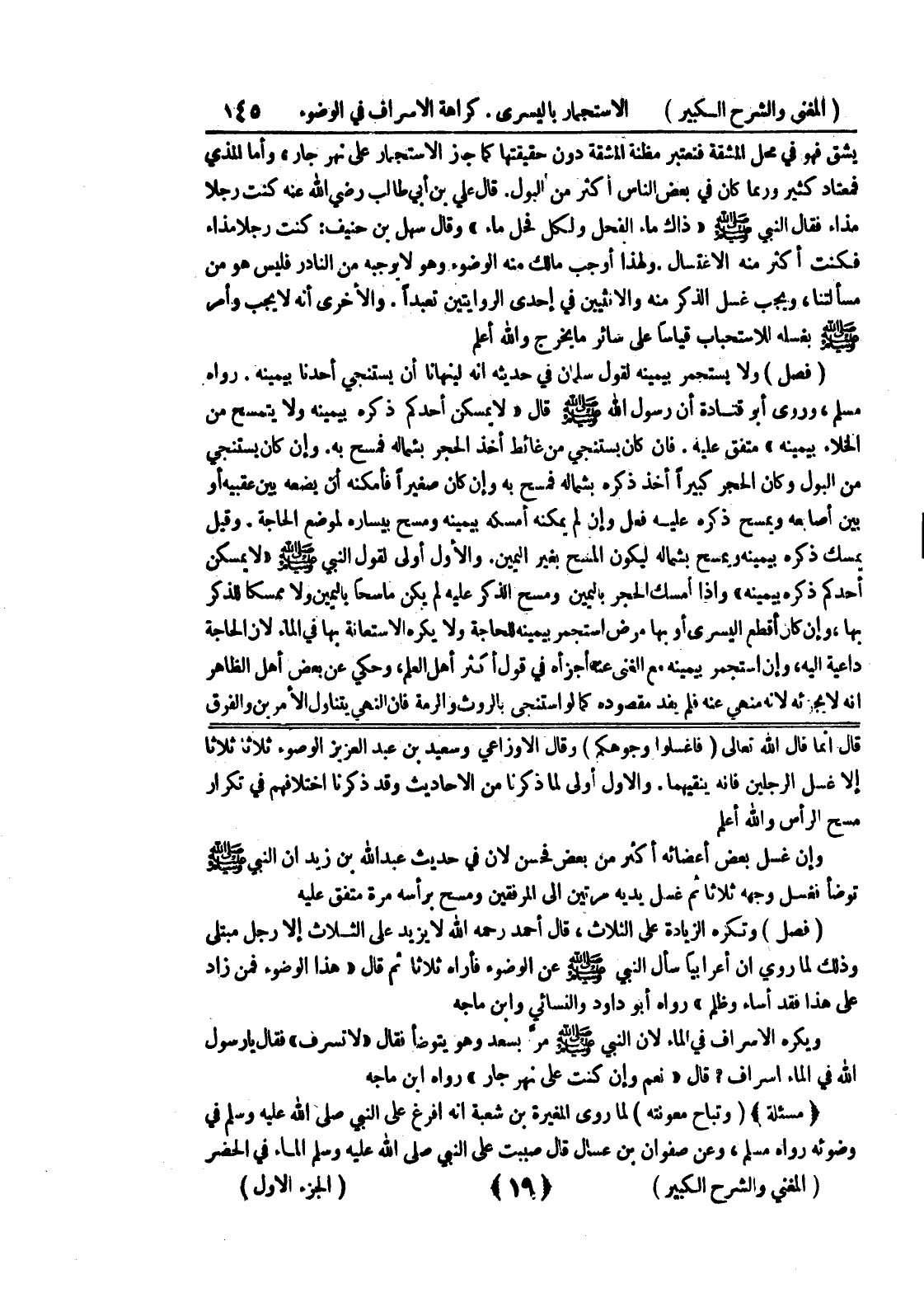 والأول أولى لما ذكرنا من الاحاديث وقد ذكرنا اختلافهم في تكرار مسح الرأس والله أعلم وإن غسل بعض أعضائه أكثر من بعض فحسن لأن في حديث عبد الله بن زيد أن النبي صلى الله عليه وسلم توضأ فغسل وجهه ثلاثا ثم غسل يديه مرتين إلى المرفقين ومسح برأسه مرة متفق عليه (فصل) وتكره الزيادة على الثلاث، قال أحمد رحمه الله لا يزيد على الثلاث إلا رجل مبتلى وذلك لما روى أن أعرابيا سأل النبي صلى الله عليه وسلم عن الوضوء فأراه ثلاثاً ثم قال " هذا الوضوء فمن زاد على هذا فقد أساء وظلم " رواه أبو داود والنسائي وابن ماجة ويكره الإسراف في الماء لأن النبي صلى الله عليه وسلم مر بسعد وهو يتوضأ فقال " لا تسرف " فقال يا رسول الله في الماء إسراف؟ قال " نعم وإن كنت على نهر جار " رواه ابن ماجه (مسألة) (وتباح معونته) لما روى المغيرة بن شعبة أنه أفرغ على النبي صلى الله عليه وسلم في وضوئه رواه مسلم، وعن صفوان بن عسال قال صببت على النبي صلى الله عليه وسلم الماء في الحضر