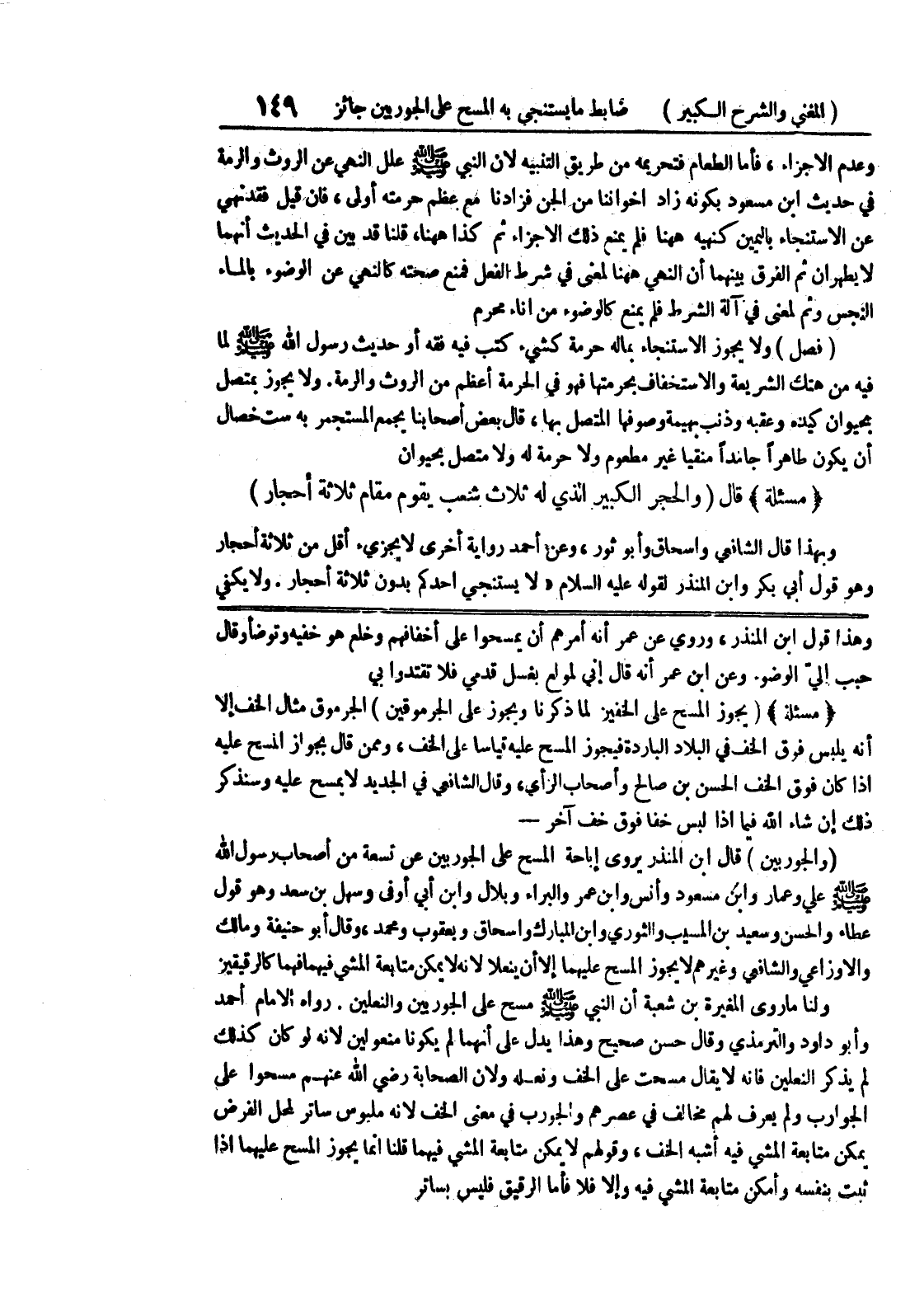 وهذا قول ابن المنذر، وروي عن عمر أنه أمرهم أن يمسحوا على أخفافهم وخلع هو خفيه وتوضأ وقال حبب إلي الوضوء وعن ابن عمر أنه قال إني لمولع بغسل قدمي فلا تقتدوا بي (مسألة) (يجوز المسح على الخفين لما ذكرنا ويجوز على الجرموقين) الجرموق مثال الخف إلا أنه يلبس فوق الخف في البلاد الباردة فيجوز المسح عليه قياسا على الخف، وممن قال بجواز المسح عليه إذا كان فوق الخف الحسن بن صالح وأصحاب الرأي، وقال الشافعي في الجديد لا يمسح عليه وسنذكر ذلك إن شاء الله فيما إذا لبس خفا فوق خف آخر (والجوربين) قال إبن المنذر يروى إباحة المسح على الجوربين عن تسعة من أصحاب رسول الله صلى الله عليه وسلم على وعمار وابن مسعود وأنس وابن عمر والبراء وبلال وابن أبي أوفى وسهل بن سعد وهو قول عطاء والحسن وسعيد بن المسيب والثوري وابن المبارك واسحاق ويعقوب ومحمد، وقال أبو حنيفة ومالك