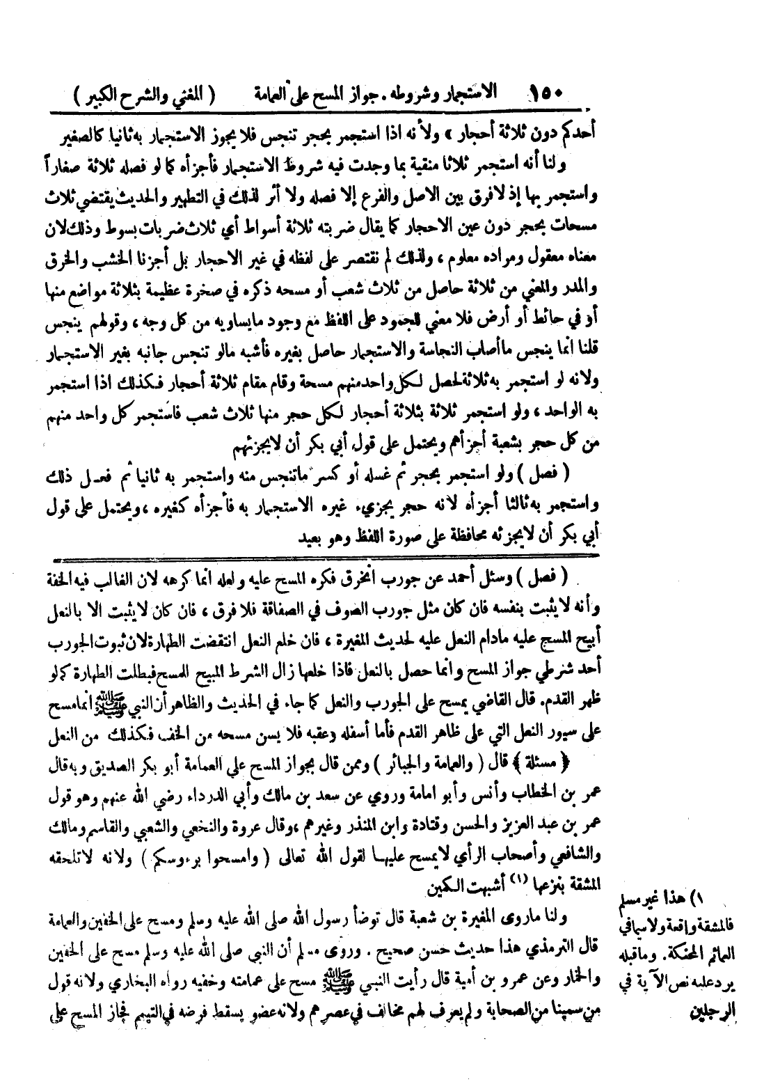 قال القاضي يمسح على الجورب والنعل كما جاء في الحديث والظاهر أن النبي صلى الله عليه وسلم إنما مسح على سيور النعل التي على ظاهر القدم فأما أسفله وعقبه فلا يسن مسحه من الخف فكذلك من النعل (مسألة) قال (والعمامة والجبائر) وممن قال بجواز المسح على العمامة أبو بكر الصديق وبه قال عمر بن الخطاب وأنس وأبو أمامة وروي عن سعد بن مالك وأبي الدرداء رضي الله عنهم وهو قول عمر بن عبد العزيز والحسن وقتادة وابن المنذر وغيرهم، وقال عروة والنخعي والشعبي والقاسم ومالك والشافعي وأصحاب الرأي لا يمسح عليها لقول الله تعالى (وامسحوا برءوسكم) ولأنه لا تلحقه المشقة بنزعها (1) أشبهت الكمين ولنا ما روى المغيرة بن شعبة قال توضأ رسول الله صلى الله عليه وسلم ومسح على الخفين والعمامة قال الترمذي هذا حديث حسن صحيح.