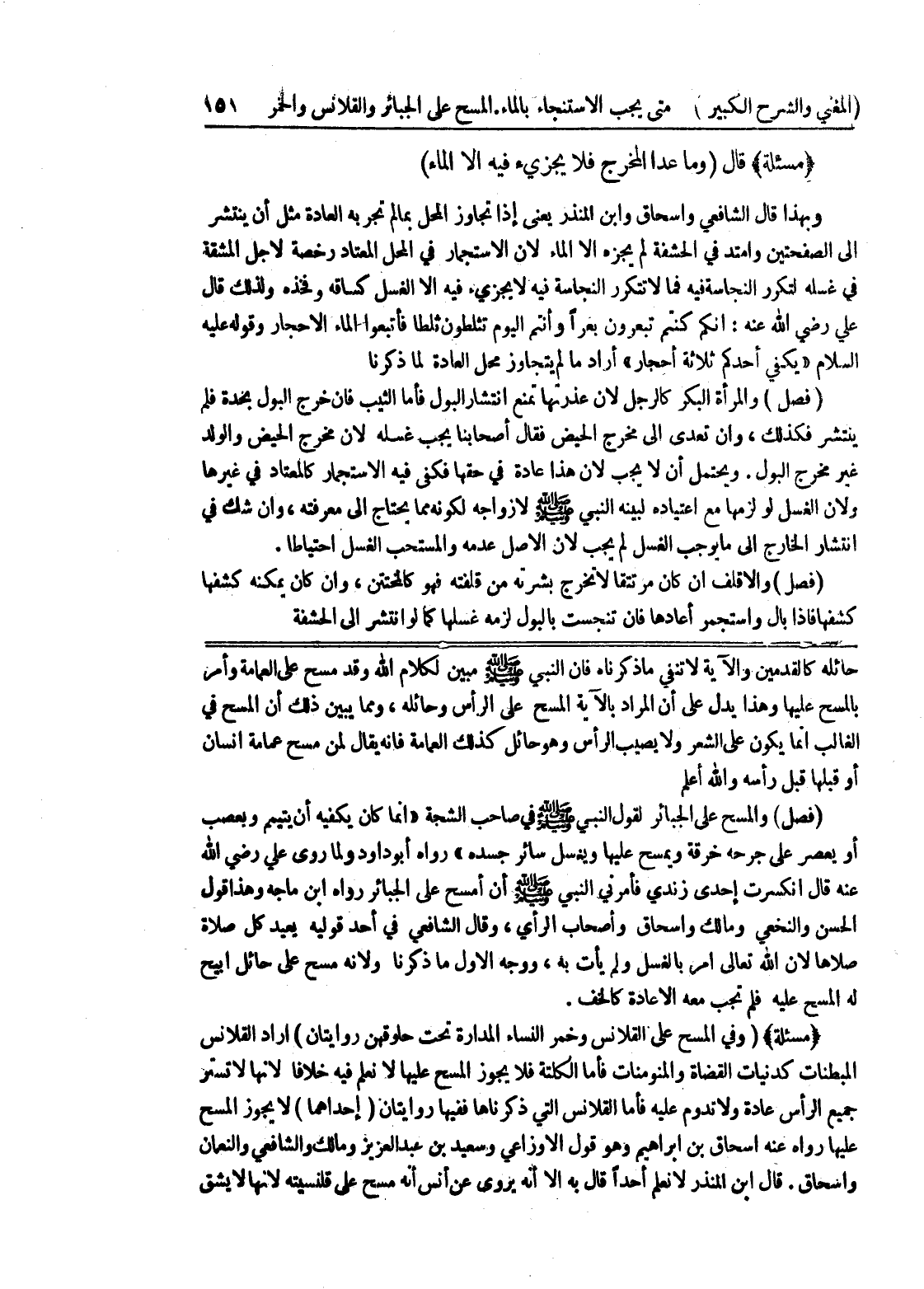 حائله كالقدمين والآية لا تنفي ما ذكرناه فإن النبي صلى الله عليه وسلم مبين لكلام الله وقد مسح على العمامة وأمر بالمسح عليها وهذا يدل على أن المراد بالآية المسح على الرأس وحائلة، ومما يبين ذلك أن المسح في الغالب إنما يكون على الشعر ولا يصيب الرأس وهو حائل كذلك العمامة فإنه يقال لمن مسح عمامة إنسان أو قبلها قبل رأسه والله أعلم (فصل) والمسح على الجبائر لقول النبي صلى الله عليه وسلم في صاحب الشجة " إنما كان يكفيه أن يتيمم وبعصب أو يعصر على جرحه خرقة ويمسح عليها ويغسل سائر جسده " رواه أبو داود ولما روى علي رضي الله عنه قال انكسرت إحدى زندي فأمرني النبي صلى الله عليه وسلم إن أمسح على الجبائر رواه ابن ماجه وهذا قول الحسن والنخعي ومالك واسحاق وأصحاب الرأي، وقال الشافعي في أحد قوليه يعيد كل صلاة صلاها لأن الله تعالى أمر بالغسل ولم يأت به، ووجه الأول ما ذكرنا ولأنه مسح على حائل أبيح له المسح عليه فلم تجب معه الإعادة كالخف.