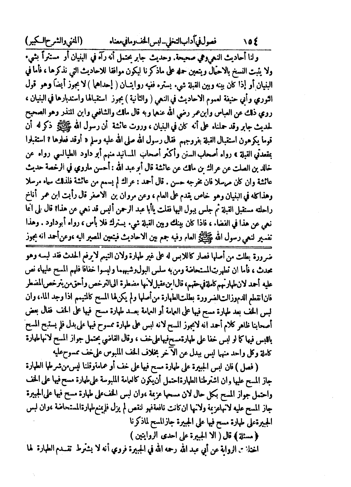 ضرورة بطلت من أصلها فصار كاللابس له على غير طهارة ولأن التيمم لا يرفع الحدث فقد لبسه وهو محدث، فأما إن تطهرت المستحاضة ومن به سلس البول وشبههما ولبسوا خفافا فلهم المسح عليها، نص عليه أحمد لأن طهارتهم كاملة في حقهم، قال ابن عقيل لأنها مضطرة إلى الترخص وأحق من يترخص المضطر فإن انقطع الدم وزالت الضرورة بطلت الطهارة من أصلها ولم يكن لها المسح كالمتيمم إذا وجد الماء، وإن لبس الخف بعد طهارة مسح فيها على العمامة أو العمامة بعد طهارة مسح فيها على الخف فقال بعض أصحابنا ظاهر كلام أحمد أنه لا يجوز المسح لأنه لبس على طهارة ممسوح فيها على بدل فلم يستبح المسح باللبس فيها كما لو لبس خفا على طهارة مسح فيها على خف، وقال القاضي يحتمل جواز المسح لأنها طهارة كاملة وكل واحد منهما ليس ببدل عن الآخر بخلاف الخف الملبوس على خف ممسوح عليه (فصل) فإن لبس الجبيرة على طهارة مسح فيها على خف أو عمامة وقلنا ليس من شرطها الطهارة جاز المسح عليها وإن اشترطنا الطهارة احتمل أن يكون كالعمامة الملبوسة على طهارة مسح فيها على الخف واحتمل جواز المسح بكل حال لأن مسحها عزيمة، وإن لبس الخف على طهارة مسح فيها على الجبيرة جاز المسح عليه لأنها عزيمة ولأنها إن كانت نافعة فهو لنقص لم يزل فلم يمنع طهارة المستحاضة، وإن لبس الجبيرة عل طهارة مسح فيها على الجبيرة جاز المسح لما ذكرنا (مسألة) قال (إلا الجبيرة على إحدى الروايتين) اختلفت الرواية عن أبي عبد الله رحمه الله في الجبيرة فروي أنه لا يشترط تقدم الطهارة لها