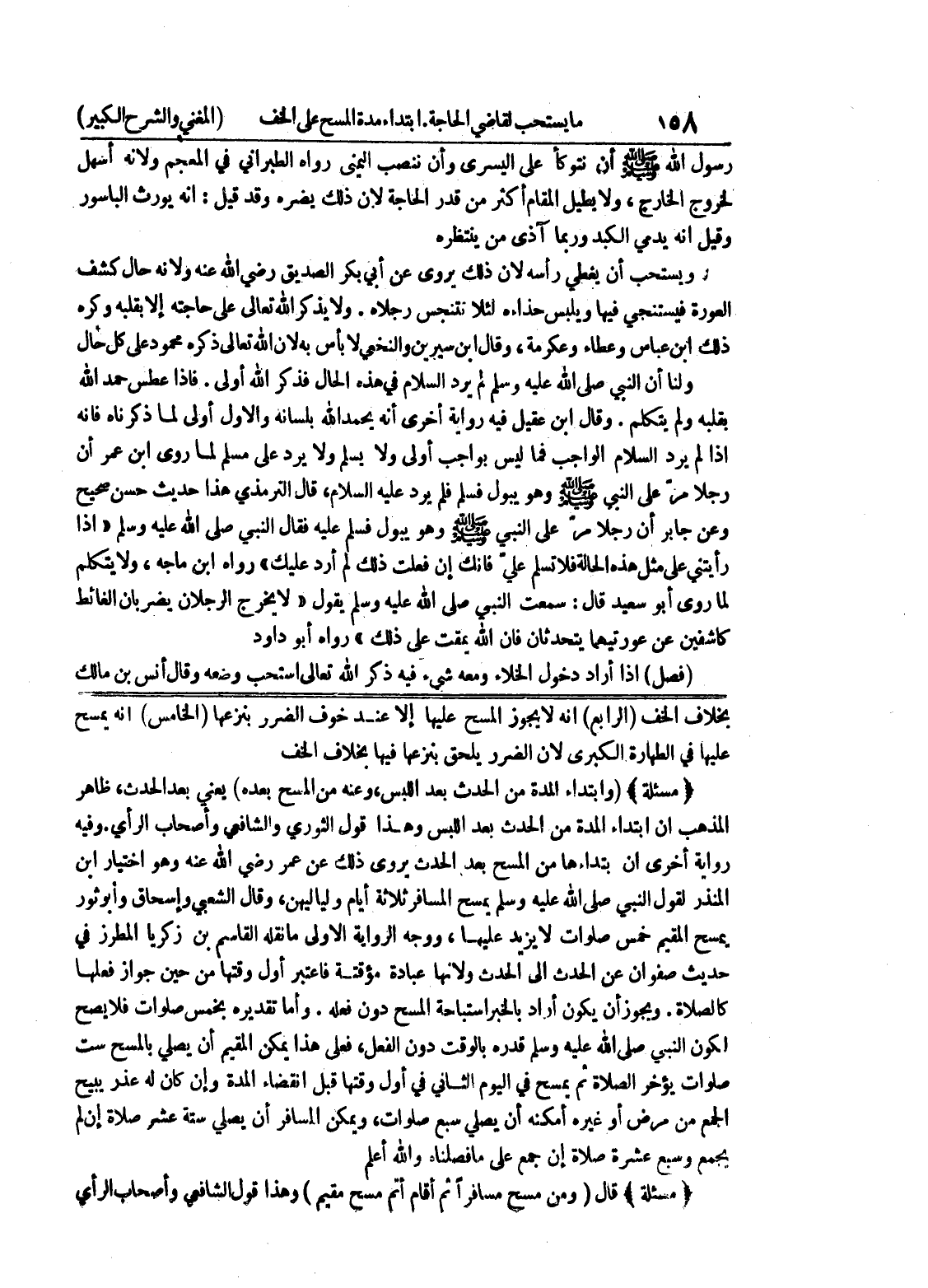 وأما تقديره بخمس صلوات فلا يصح لكون النبي صلى الله عليه وسلم قدره بالوقت دون الفعل، فعلى هذا يمكن المقيم أن يصلي بالمسح ست صلوات يؤخر الصلاة ثم يمسح في اليوم الثاني في أول وقتها قبل انقضاء المدة وإن كان له عذر يبيح الجمع من مرض أو غيره أمكنه أن يصلي سبع صلوات، ويمكن المسافر أن يصلي ستة عشر صلاة إن لم يجمع وسبع عشرة صلاة إن جمع على ما فصلناه والله أعلم (مسألة) قال (ومن مسح مسافرا ثم أقام أتم مسح مقيم) وهذا قول الشافعي وأصحاب الرأي