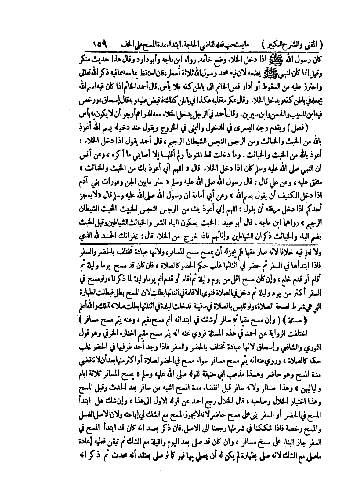 (مسألة) (وإن مسح مقيما ثم سافر أو شك في ابتادئه أتم مسح مقيم، وعنه يتم مسح مسافر) اختلفت الرواية عن أحمد في هذه المسألة فروي عنه أنه يتم مسح مقيم اختاره الخرقي وهو قول الثوري والشافعي وإسحاق لأنها عبادة تختلف بالحضر والسفر فإذا وجد أحد طرفيها في الحضر غلب حكمه كالصلاة، وروي عنه أنه يتم مسح مسافر سواء مسح في الحضر لصلاة أو أكثر منها بعد أن لا تنقضي مدة المسح وهو حاضر وهذا مذهب أبي حنيفة لقوله صلى الله عليه وسلم " يمسح المسافر ثلاثة أيام ولياليهن " وهذا مسافر ولأنه سافر قبل انقضاء مدة المسح أشبه من سافر بعد الحدث وقبل المسح وهذا اختيار الخلال وصاحبه، قال الخلال رجع أحمد عن قوله الأول إلى هذا، وإن شك هل ابتدأ المسح في الحضر أو السفر بنى على مسح حاضر لأنه لا يجوز المسح مع الشك في إباحته ولأن الأصل الغسل والمسح رخصة فإذا شككنا في شرطها رجعنا إلى الأصل.