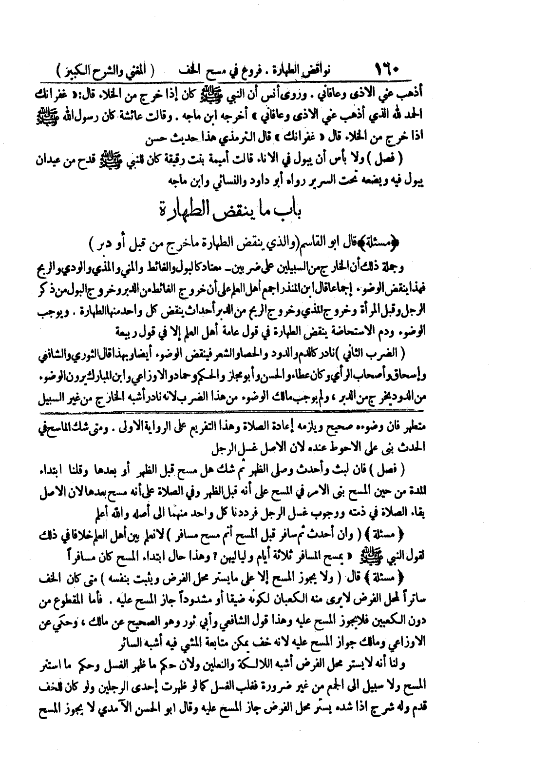 ومتى شك الماسح في الحدث بنى على الأحوط عنده لأن الأصل غسل الرجل (فصل) فإن لبث وأحدث وصلى الظهر ثم شك هل مسح قبل الظهر أو بعدها وقلنا ابتداء المدة من حين المسح بنى الأمر في المسح على أنه قبل الظهر وفي الصلاة على أنه مسح بعدها لأن الأصل بقاء الصلاة في ذمته ووجوب غسل الرجل فرددنا كل واحد منهما إلى أصله والله أعلم (مسألة) (وإن أحدث ثم سافر قبل المسح أتم مسح مسافر) لا نعلم بين أهل العلم خلافاً في ذلك لقول النبي صلى الله عليه وسلم " يمسح المسافر ثلاثة أيام ولياليهن؟ وهذا حال ابتداء المسح كان مسافرا (مسألة) قال (ولا يجوز المسح إلا على ما يستر محل الفرض ويثبت بنفسه) متى كان الخف ساترا لمحل الفرض لا يرى منه الكعبان لكونه ضيقا أو مشدودا جاز المسح عليه.
