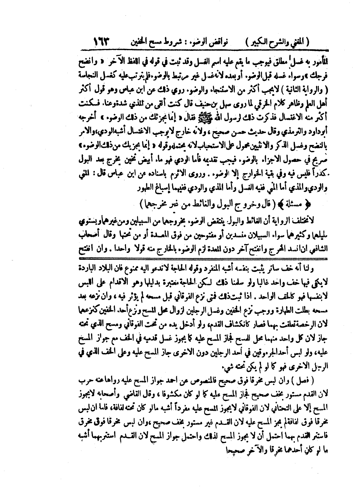 عليه، ولو لبس أحد الجرموقين في أحد الرجلين دون الأخرى جاز المسح عليه وعلى الخف الذي في الرجل الأخرى فهو كما لو لم يكن تحته شئ (فصل) وإن لبس مخرقا فوق صحيح فالمنصوص عن أحمد جواز المسح عليه رواها عنه حرب لأن القدم مستور بخف صحيح فجاز المسح عليه كما لو كان مكشوفا، وقال القاضي وأصحابه لا يجوز المسح إلا على التحتاني لأن الفوقاني لا يجوز المسح عليه مفردا أشبه مالو كان تحته لفافة، فإما إن لبس مخرقا فوق لفافة لم يجز المسح عليه لأن القدم غير مستور بخف صحيح، وإن لبس مخرقا فوق مخرق فاستتر القدم بهما احتمل أن لا يجوز المسح لذلك واحتمل جواز المسح لأن القدم استتر بهما أشبه مالو كان أحدهما مخرقا والآخر صحيحا