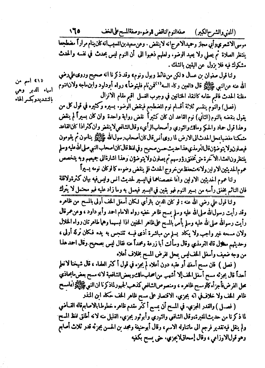 ولنا قول علي رضي الله عنه: لو كان الدين بالرأي لكان أسفل الخف أولى بالمسح من ظاهره وقد رأيت رسول الله صلى الله عليه وسلم يمسح ظاهر خفيه رواه الإمام أحمد وأبو داود، وعن عمر قال رأيت رسول الله صلى الله عليه وسلم يأمر بالمسح على ظاهر الخفين إذا لبسهما وهما طاهرتان رواه الخلال ولأن مسحه غير واجب ولا يكاد يسلم من مباشرة أذى فيه تتنجس به يده فكان تركه أولى، وحديثهم معلول قاله الترمذي وقال وسألت أبا زرعة ومحمدا عنه فقال ليس بصحيح وقال أحمد هذا من وجه ضعيف وأسفل الخف ليس بمحل لفرض المسح بخلاف أعلاه (فصل) فإن مسح أسفله أو عقبه دون أعلاه لم يجزه في قول أكثر العلماء، قال شيخنا لا نعلم أحدا قال يجزئه مسح أسفل الخف إلا أشهب من أصحاب مالك وبعض الشافعية لأنه مسح بعض ما يحاذي محل الفرض فأجزأه كما لو مسح ظاهره، ومنصوص الشافعي كمذهب الجمهور لما ذكرنا أن النبي صلى الله عليه وسلم إنما مسح ظاهر الخف ولا خلاف في أنه يجزئ الاقتصار على مسح ظاهر الخف حكاه ابن المنذر (فصل) والقدر المجزئ في المسح أن يمسح أكثر مقدم ظاهره خطوطا بالاصابع قاله القاضي لما ذكرنا من حديث المغيرة، وقال الشافعي والثوري وأبو ثور يجزئ القليل منه لأنه أطلق لفظ المسح ولم ينقل فيه تقدير فرجع إلى ما تناوله الاسم، وقال أبو حنيفة ومحمد بن الحسن يجزئه قدر ثلاث أصابع وهو قول الأوزاعي، وقال إسحاق لا يجزئ حتى يمسح بكفيه