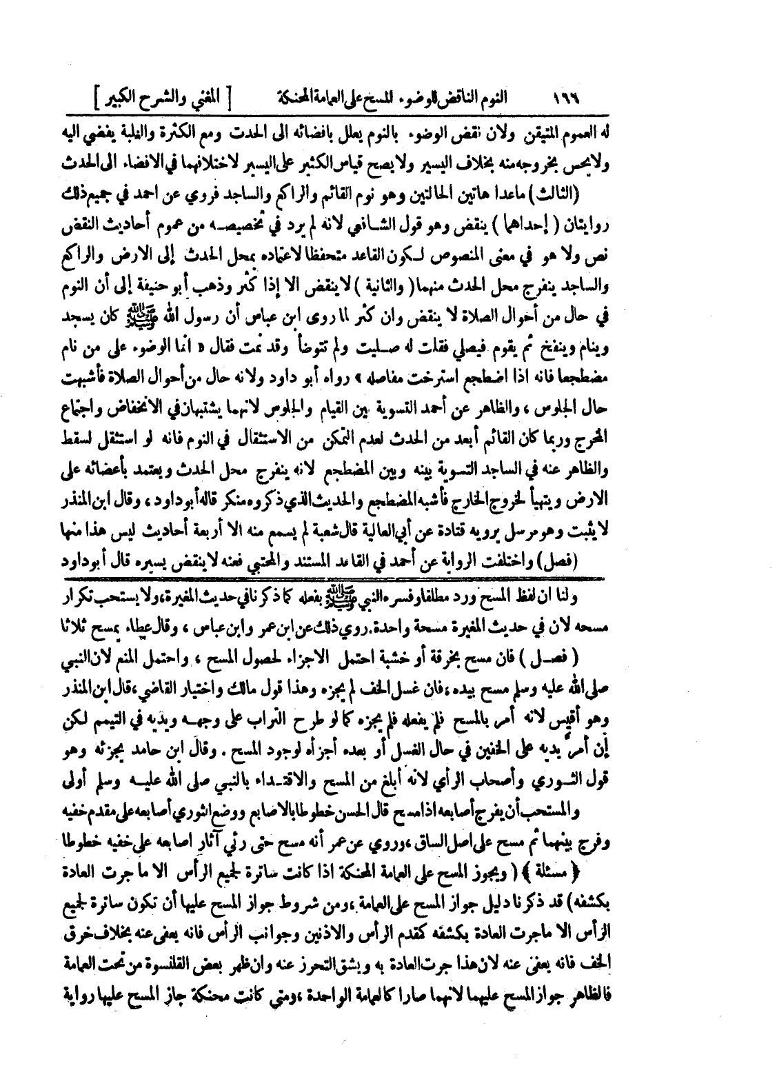 وقال ابن حامد يجزئه وهو قول الثوري وأصحاب الرأي لأنه أبلغ من المسح والاقتداء بالنبي صلى الله عليه وسلم أولى والمستحب أن يفرج أصابعه إذا مسح قال الحسن خطوطا بالأصابع ووضع الثوري أصابعه على مقدم خفيه وفرج بينهما ثم مسح على أصل الساق، وروي عن عمر أنه مسح حتى رئي آثار أصابعه على خفيه خطوطا (مسألة) (ويجوز المسح على العمامة المحنكة إذا كانت ساترة لجميع الرأس إلا ما جرت العادة بكشفه) قد ذكرنا دليل جواز المسح على العمامة، ومن شروط جواز المسح عليها أن تكون ساترة لجميع الرأس إلا ما جرت العادة بكشفه كمقدم الرأس والأذنين وجوانب الرأس فإنه يعفى عنه بخلاف خرق الخف فإنه يعفى عنه لأن هذا جرت العادة به ويشق التحرز عنه وإن ظهر بعض القلنسوة من تحت العمامة فالظاهر جواز المسح عليهما لأنهما صارا كالعمامة الواحدة، ومتى كانت محنكة جاز المسح عليها رواية
