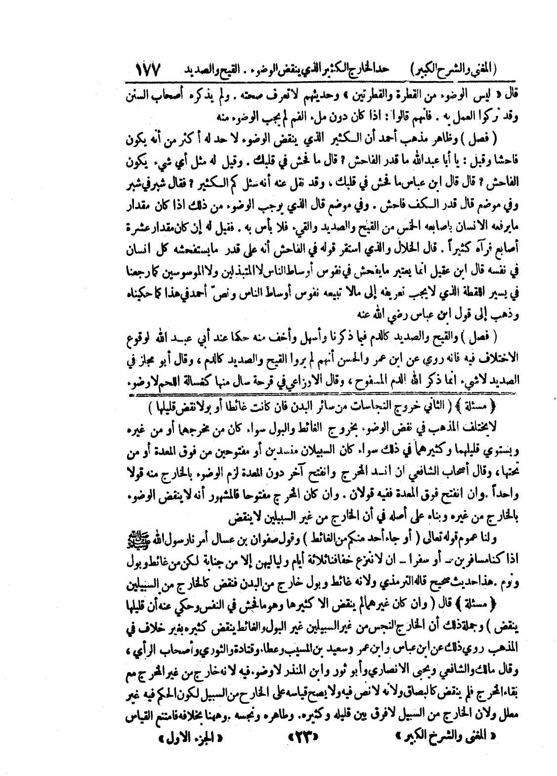 هذا حديث صحيح قاله الترمذي ولأنه غائط وبول خارج من البدن فنقض كالخارج من السبيلين (مسألة) قال (وإن كان غيرهما لم ينقض إلا كثيرها وهو ما فحش في النفس وحكي عنه ان قليلها ينقض) وجملة ذلك أن الخارج النجس من غير السبيلين غير البول والغائط ينقض كثيره بغير خلاف في المذهب روى ذلك عن ابن عباس وابن عمر وسعيد بن المسيب وعطاء وقتادة والثوري وأصحاب الرأي، وقال مالك والشافعي ويحيى الانصاري وأبو ثور وابن المنذر لا وضوء فيه لأنه خارج من غير المخرج مع بقاء المخرج فلم ينقض كالبصاق ولانه لانص فيه ولا يصح قياسه على الخارج من السبيل لكون الحكم فيه غير معلل ولأن الخارج من السبيل لا فرق بين قليله وكثيره.