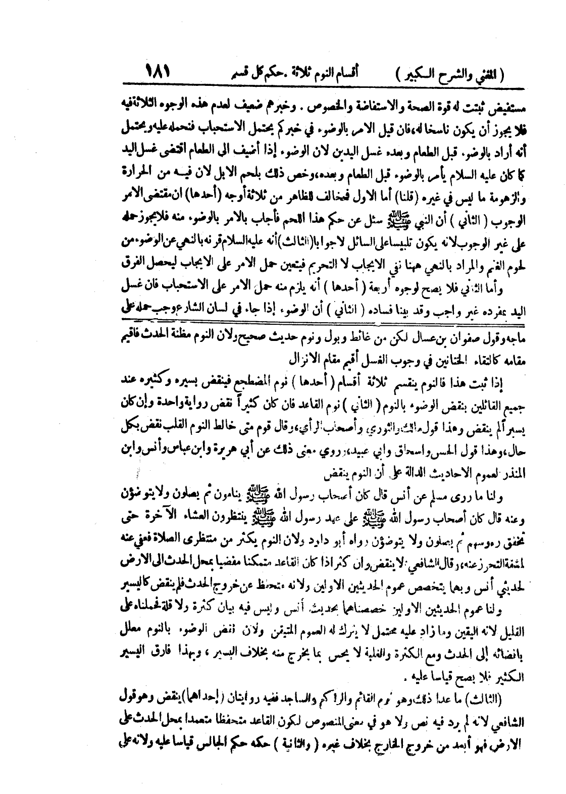ماجه وقول صفوان بن عسال لكن من غائط وبول ونوم حديث صحيح ولأن النوم مظنة الحدث فأقيم مقامه كالتقاء الختانين في وجوب الغسل أقيم مقام الإنزال إذا ثبت هذا فالنوم ينقسم ثلاثة أقسام (أحدها) نوم المضطجع فينقض يسيره وكثيره عند جميع القائلين بنقض الوضوء بالنوم (الثاني) نوم القاعد فإن كان كثيرا نقض رواية واحدة وان كان يسيراً لم ينقض وهذا قول مالك والثوري وأصحاب الرأي، وقال قوم متى خالط النوم القلب نقض بكل حال، وهذا قول الحسن واسحاق وابي عبيد، وروي معنى ذلك عن أبي هريرة وابن عباس وأنس وابن المنذر لعموم الأحاديث الدالة على أن النوم ينقض ولنا ما روى مسلم عن أنس قال كان أصحاب رسول الله صلى الله عليه وسلم ينامون ثم يصلون ولا يتوضؤن وعنه قال كان أصحاب رسول الله صلى الله عليه وسلم على عهد رسول الله صلى الله عليه وسلم ينتظرون العشاء الآخرة حتى تخفق رؤوسهم ثم يصلون ولا يتوضؤن رواه أبو داود ولأن النوم يكثر من منتظري الصلاة فعفي عنه لمشقة التحرز عنه، وقال الشافعي، لا ينقض وإن كثر إذا كان القاعد متمكنا مفضيا بمحل الحدث إلى الأرض لحديثي أنس وبهما يتخصص عموم الحديثين الأولين ولأنه متحفظ عن خروج الحدث فلم ينقض كاليسير ولنا عموم الحديثين الأولين خصصناهما بحديث أنس وليس فيه بيان كثرة ولا قلة فحملناه على القليل لأنه اليقين وما زاد عليه محتمل لا يترك له العموم المتيقن ولأن نقض الوضوء بالنوم معلل بإفضائه إلى الحدث ومع الكثرة والغلبة لا يحس بما يخرج منه بخلاف اليسير، وبهذا فارق اليسير الكثير فلا يصح قياسا عليه.