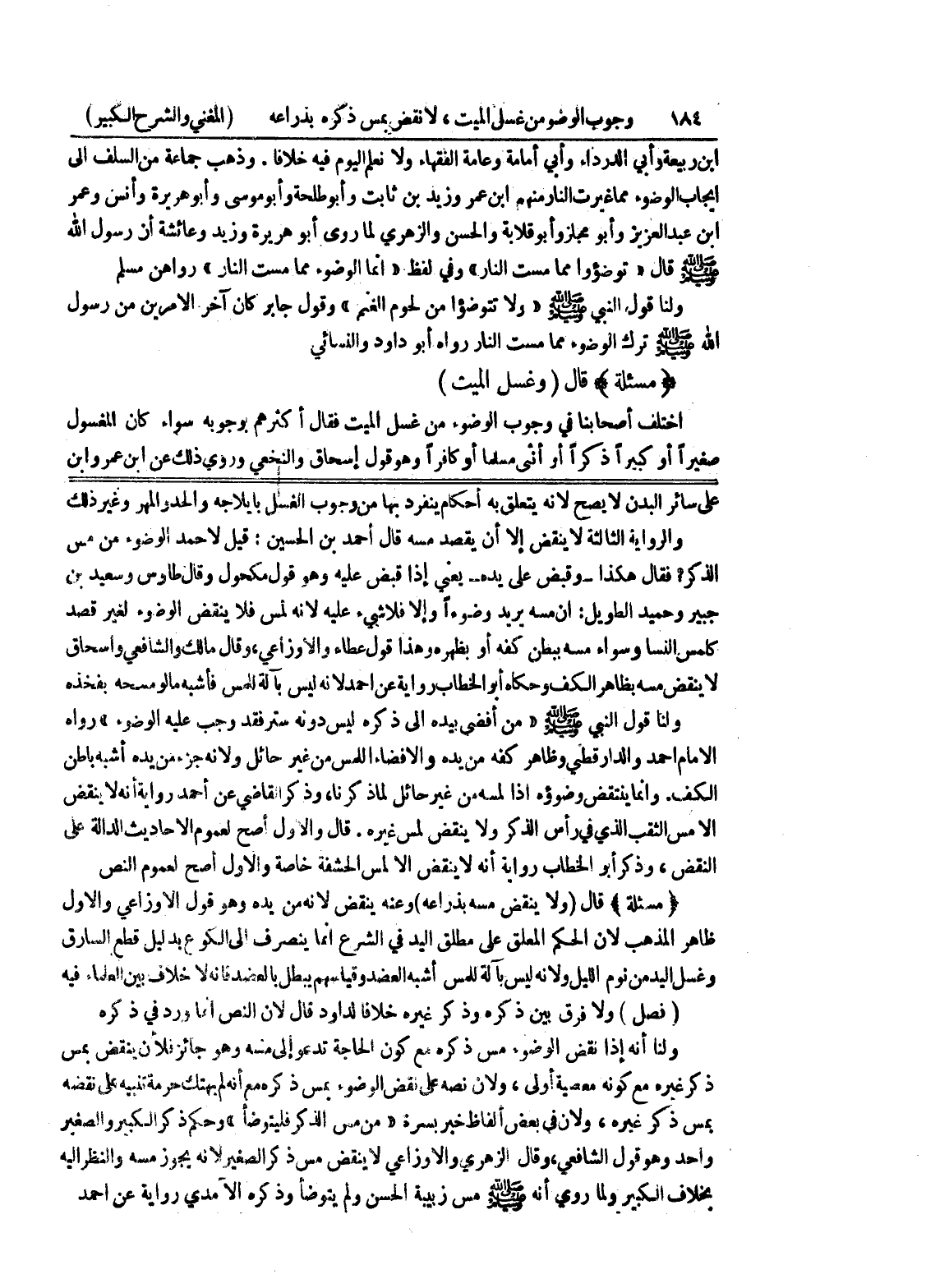 الذكر؟ فقال هكذا - وقبض على يده - يعني إذا قبض عليه وهو قول مكحول وقال طاوس وسعيد بن جبير وحميد الطويل: إن مسه يريد وضوءا وإلا فلا شئ عليه لأنه لمس فلا ينقض الوضوء لغير قصد كلمس النسا وسواء مسه ببطن كفه أو بظهره وهذا قول عطاء والاوزاعي، وقال مالك والشافعي واسحاق لا ينقض مسه بظاهر الكف وحكاه أبو الخطاب رواية عن أحمد لأنه ليس بآلة للمس فأشبه مالو مسحه بفخذه ولنا قول النبي صلى الله عليه وسلم " من أفضى بيده إلى ذكره ليس دونه ستر فقد وجب عليه الوضوء " رواه الإمام أحمد والدارقطني وظاهر كفه من يده والإفضاء اللمس من غير حائل ولأنه جزء من يده أشبه باطن الكف.