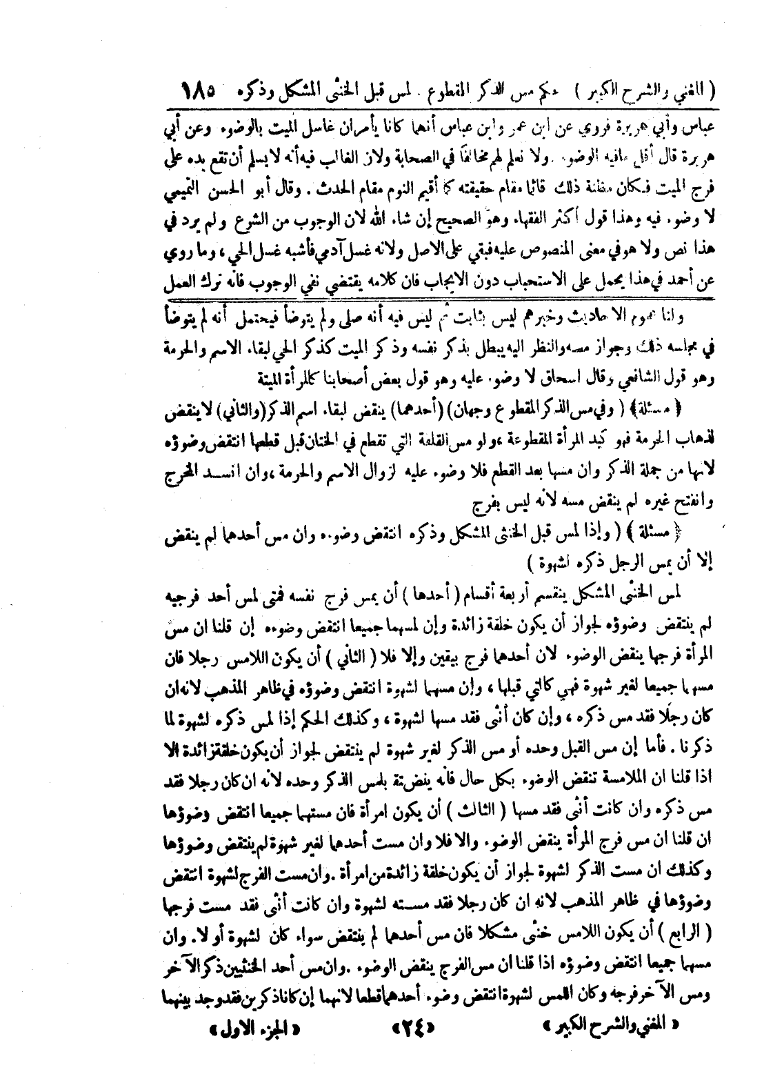 (مسألة) (وفي مس الذكر المقطوع وجهان) (أحدهما) ينقض لبقاء اسم الذكر (والثاني) لا ينقض لذهاب الحرمة فهو كيد المرأة المقطوعة، ولو مس القلفة التي تقطع في الختان قبل قطعها انتقض وضوؤه لأنها من جملة الذكر وإن مسها بعد القطع فلا وضوء عليه لزوال الاسم والحرمة، وإن انسد المخرج وانفتح غيره لم ينقض مسه لأنه ليس بفرج (مسألة) (وإذا لمس قبل الخنثى المشكل وذكره انتقض وضوءه وإن مس أحدهما لم ينقض إلا أن يمس الرجل ذكره لشهوة) لمس الخنثى المشكل ينقسم أربعة اقسام (أحدها) أن يمس فرج نفسه فمتى لمس أحد فرجيه لم ينتقض وضوؤه لجواز أن يكون خلقة زائدة وإن لمسهما جميعا انتقض وضوءه إن قلنا إن مس المرأة فرجها ينقض الوضوء لأن أحدهما فرج بيقين وإلا فلا (الثاني) أن يكون اللامس رجلا فإن مسهما جميعا لغير شهوة فهي كالتي قبلها، وإن مسهما لشهوة انتقض وضوؤه في ظاهر المذهب لأنه إن كان رجلا فقد مس ذكره، وإن كان أنثى فقد مسها لشهوة، وكذلك الحكم اذا لمس ذكره لشهوة لما ذكرنا.