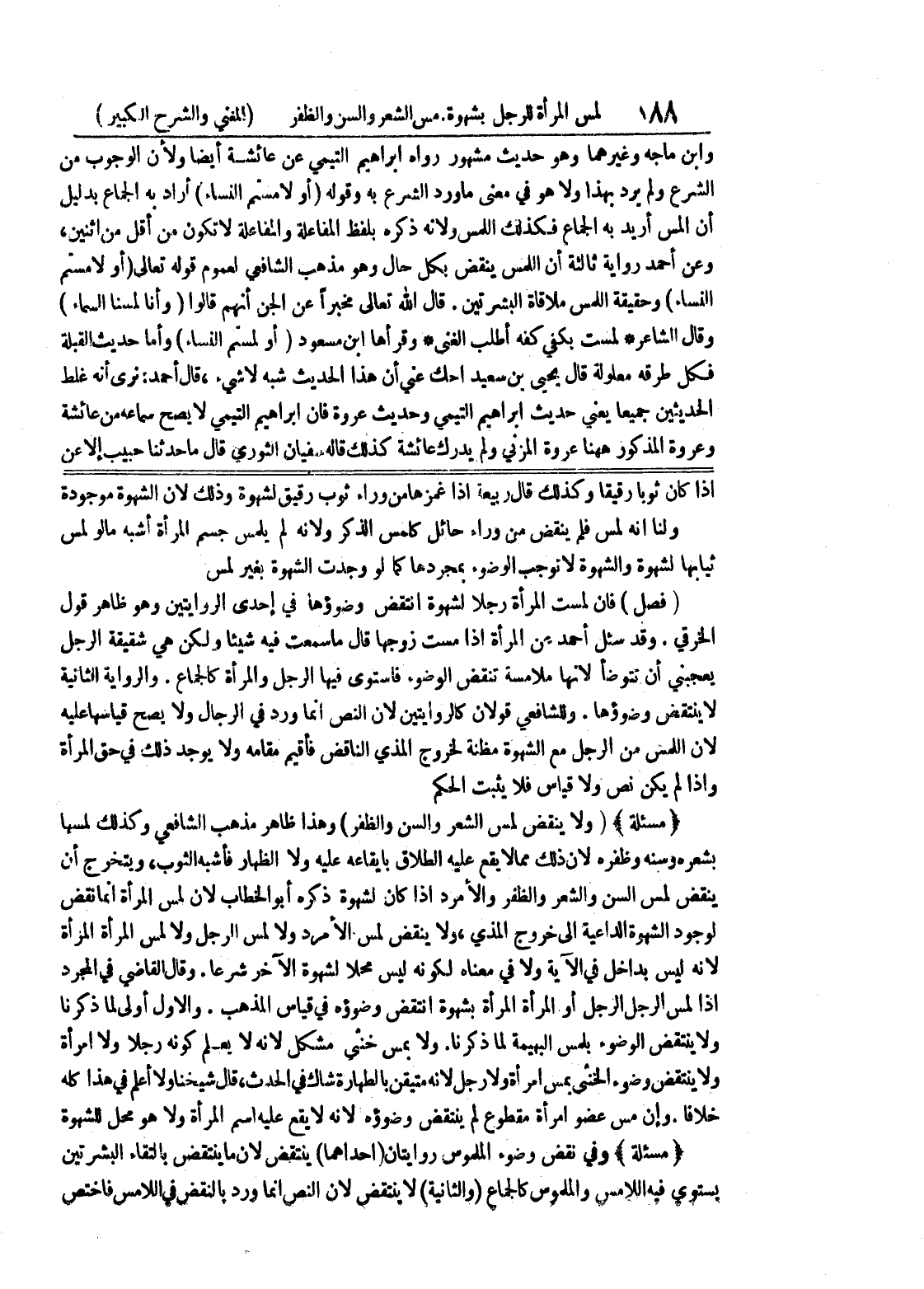 ولنا أنه لمس فلم ينقض من وراة حائل كلمس الذكر ولأنه لم يلمس جسم المرأة أشبه مالو لمس ثيابها لشهوة والشهوة لا توجب الوضوء بمجردها كما لو وجدت الشهوة بغير لمس (فصل) فإن لمست المرأة رجلا لشهوة انتقض وضوؤها في إحدى الروايتين وهو ظاهر قول الخرقي.