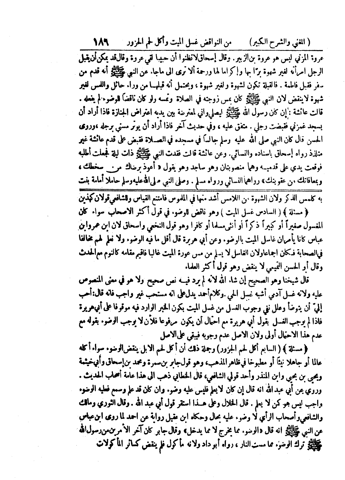 وكلام أحمد يدل على أنه مستحب غير واجب فانه قال: أحب إلي أن يتوضأ وعلل نفي وجوب الغسل من غسل الميت بكون الخبر الوارد فيه موقوفا على أبي هريرة فإذا لم يوجب الغسل بقول أبي هريرة مع احتمال أن يكون مرفوعا فلأن لا يوجب الوضوء بقوله مع عدم هذا الاحتمال أولى ولأن الأصل عدم وجوبه فيبقى على الأصل (مسألة) (السابع أكل لحم الجزور) وجملة ذلك أن أكل لحم الإبل ينقض الوضوء سواء أكله عالما أو جاهلا نيئا أو مطبوخا في ظاهر المذهب، وهو قول جابر بن سمرة ومحمد بن إسحاق وأبي خيثمة ويحيى بن يحيى وابن المنذر وأحد قولي الشافعي، قال الخطابي ذهب إلى هذا عامة أصحاب الحديث.