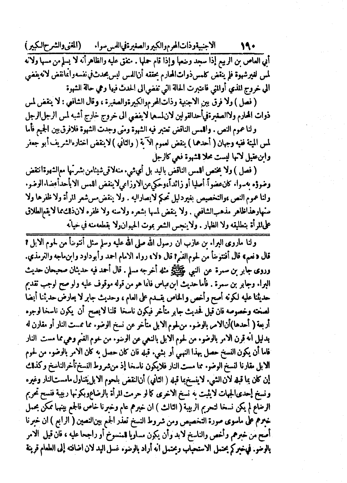 ولنا ما روى البراء بن عازب أن رسول الله صلى الله عليه وسلم سئل انتوضأ من لحوم الابل؟ قال " نعم " قال أفنتوضأ من لحوم الغنم؟ قال " لا " رواه الإمام أحمد وأبو داود وابن ماجة والترمذي.