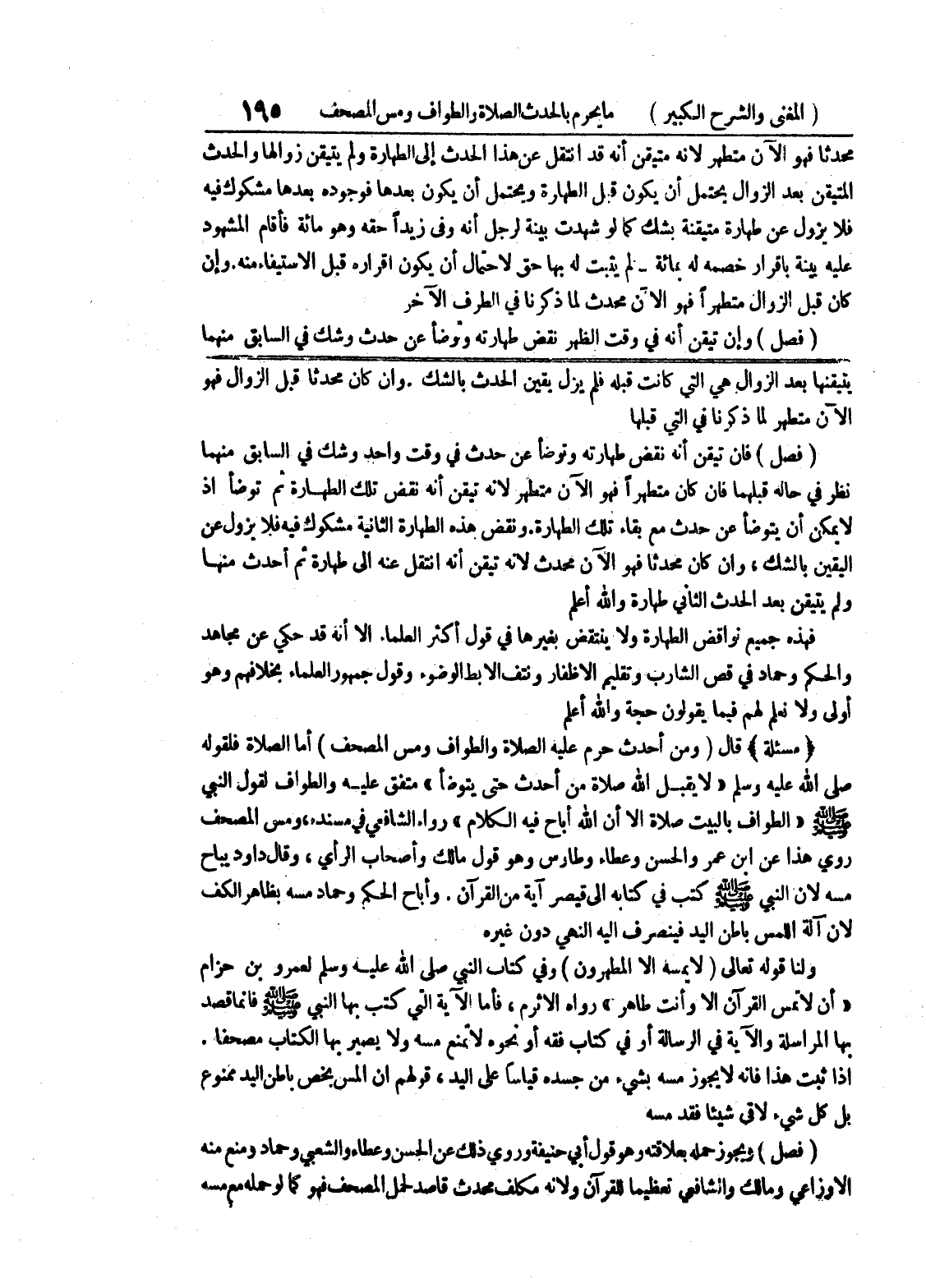 ونقض هذه الطهارة الثانية مشكوك فيه فلا يزول عن اليقين بالشك، وإن كان محدثا فهو الآن محدث لأنه تيقن أنه انتقل عنه إلى طهارة ثم أحدث منها ولم يتيقن بعد الحدث الثاني طهارة والله أعلم فهذه جميع نواقض الطهارة ولا ينتقض بغيرها في قول أكثر العلماء الا أنه قد حكي عن مجاهد والحكم وحماد في قص الشارب وتقليم الأظفار ونتف الأبط الوضوء وقول جمهور العلماء بخلافهم وهو أولى ولا نعلم لهم فيما يقولون حجة والله أعلم (مسألة) قال (ومن أحدث حرم عليه الصلاة والطواف ومس المصحف) أما الصلاة فلقوله صلى الله عليه وسلم " لا يقبل الله صلاة من أحدث حتى يتوضأ " متفق عليه والطواف لقول النبي صلى الله عليه وسلم " الطواف بالبيت صلاة ألا أن الله أباح فيه الكلام " رواه الشافعي في مسنده، ومس المصحف روي هذا عن ابن عمر والحسن وعطاء وطاوس وهو قول مالك وأصحاب الرأي، وقال داود يباح