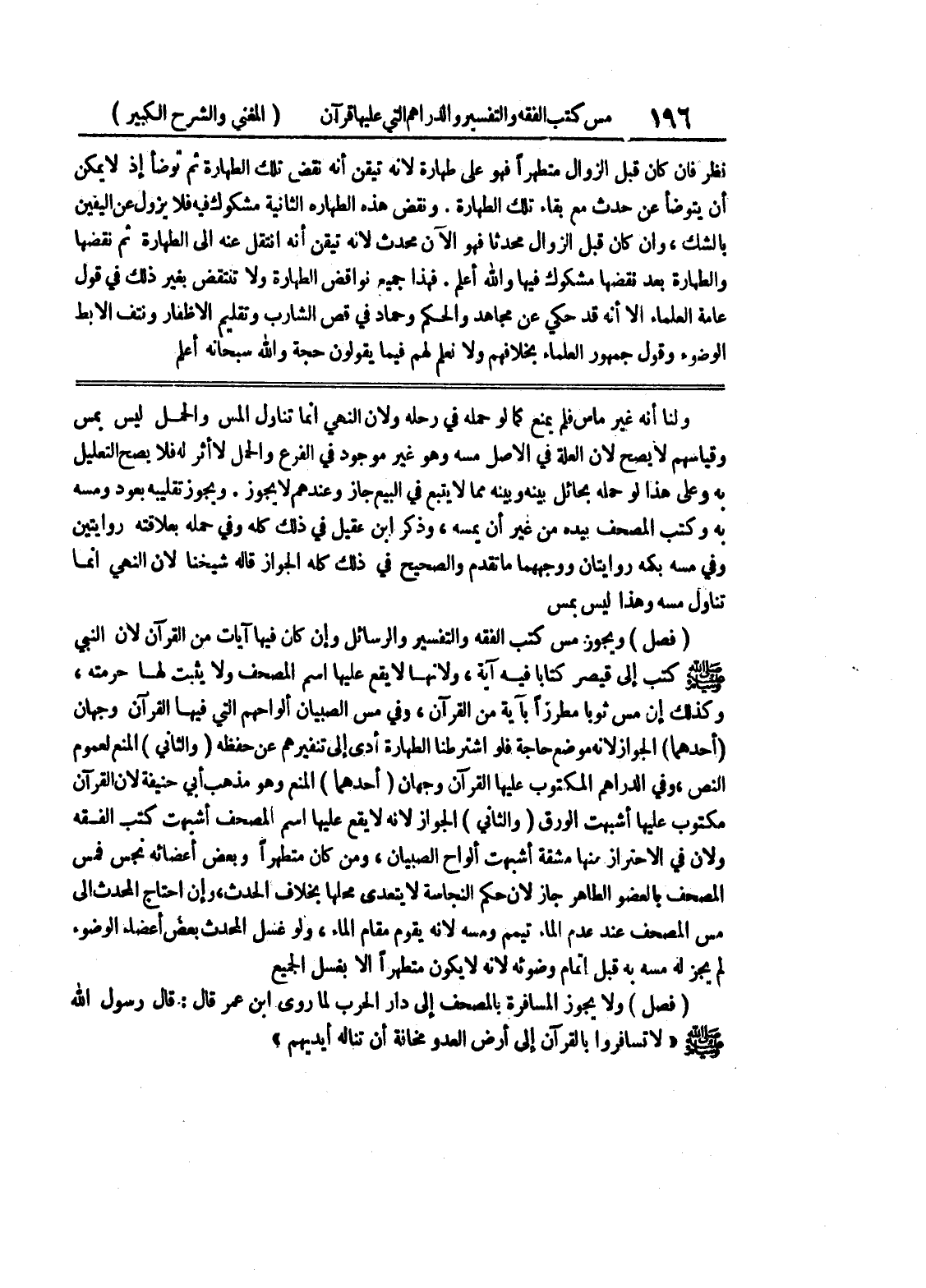 ولأن في الاحتراز منها مشقة أشبهت ألواح الصبيان، ومن كان متطهرا وبعض أعضائه نجس فمس المصحف بالعضو الطاهر جاز لأن حكم النجاسة لا يتعدى محلها بخلاف الحدث، وإن احتاج المحدث إلى مس المصحف عند عدم الماء تيمم ومسه لأنه يقوم مقام الماء، ولو غسل المحدث بعض أعضاء الوضوء لم يجز له مسه به قبل إتمام وضوئه لأنه لا يكون متطهرا إلا بغسل الجميع (فصل) ولا يجوز المسافرة بالمصحف إلى دار الحرب لما روى ابن عمر قال: قال رسول الله صلى الله عليه وسلم " لا تسافروا بالقرآن إلى أرض العدو مخافة أن تناله أيديهم "