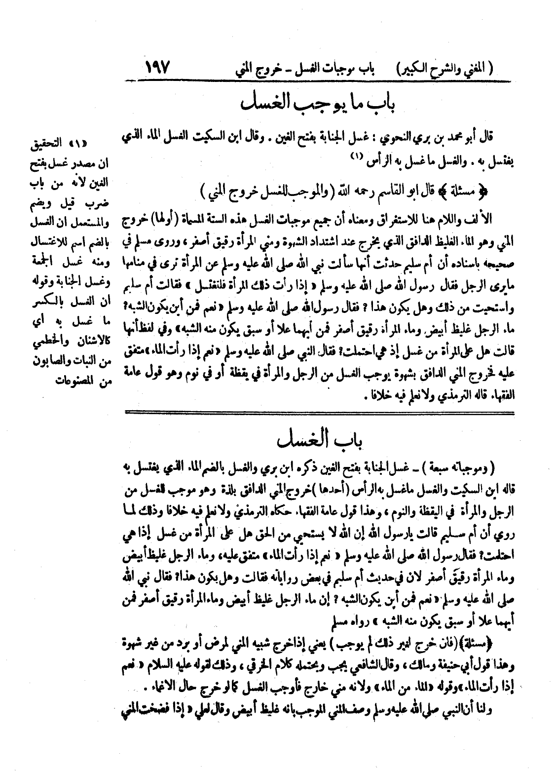 باب الغسل (وموجباته سبعة) - غسل الجنابة بفتح الغين ذكره ابن بري والغسل بالضم الماء الذي يغتسل به قاله ابن السكيت والغسل ما غسل به الرأس (أحدها) خروج المني الدافق بلذة وهو موجب للغسل من الرجل والمرأة في اليقظة والنوم، وهذا قول عامة الفقهاء حكاه الترمذي ولا نعلم فيه خلافا وذلك لما روى أن أم سليم قالت يا رسول الله أن الله لا يستحيي من الحق هل على المرأة من غسل إذا هي احتلمت؟ فقال رسول الله صلى الله عليه وسلم " نعم إذا رأت الماء " متفق عليه، وماء الرجل غليظ أبيض وماء المرأة رقيق أصفر لأن في حديث أم سليم في بعض رواياته فقالت وهل يكون هذا؟ فقال نبي الله صلى الله عليه وسلم " نعم فمن أين يكون الشبه؟ إن ماء الرجل غليظ أبيض وماء المرأة رقيق أصفر فمن أيهما علا أو سبق يكون منه الشبه " رواه مسلم (مسألة) (فإن خرج لغير ذلك لم يوجب) يعني إذا خرج شبيه المني لمرض أو برد من غير شهوة وهذا قول أبي حنيفة ومالك، وقال الشافعي يجب ويحتمله كلام الخرقي، وذلك لقوله عليه السلام " نعم إذا رأت الماء " وقوله " الماء من الماء " ولأنه مني خارج فأوجب الغسل كما لو خرج حال الإغماء.
