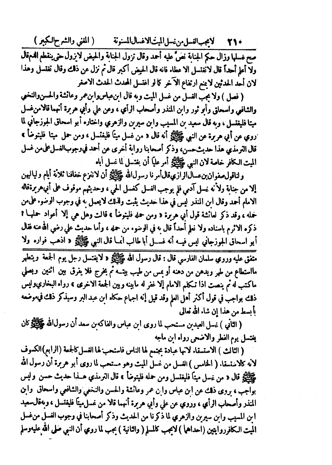 متفق عليه وروى سلمان الفارسي قال: قال رسول الله صلى الله عليه وسلم " لا يغتسل رجل يوم الجمعة ويتطهر ما استطاع من طهر ويدهن من دهنه أو يمس من طيب بيته ثم يخرج فلا يفرق بين اثنين ويصلي ما كتب له ثم ينصت إذا تكلم الإمام إلا غفر له ما بينه وبين الجمعة الأخرى " رواه البخاري وليس ذلك بواجب في قول أكثر أهل العلم وقد قيل إنه إجماع حكاه ابن عبد البر وسيذكر ذلك في موضعه بأبسط من هذا إن شاء الله تعالى (الثاني) غسل العيدين مستحب لما روى ابن عباس والفاكه بن سعد أن رسول الله صلى الله عليه وسلم كان يغتسل يوم الفطر والأضحى رواه ابن ماجه (الثالث) الاستسقاء لأنها عبادة يجتمع لها الناس فاستحب لها الغسل كالجمعة (الرابع) الكسوف لأنه كالاستسقاء (الخامس) الغسل من غسل الميت وهو مستحب لما روى أبو هريرة أن رسول الله صلى الله عليه وسلم قال " من غسل ميتا فليغتسل ومن حمله فليتوضأ " قال الترمذي هذا حديث حسن وليس بواجب، يروي ذلك عن ابن عباس وابن عمر وعائشة والحسن والنخعي والشافعي وإسحاق وابن المنذر وأصحاب الرأي، وروي عن علي وأبي هريرة أنهما قالا من غسل ميتا فليغتسل، وبه قال سعيد