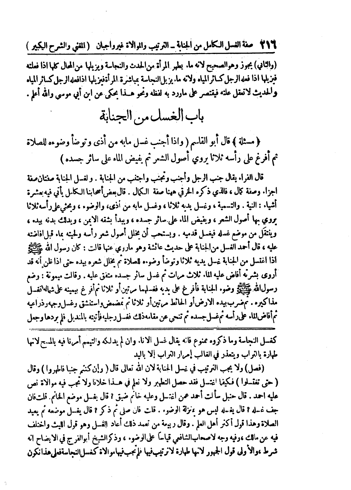 كغسل النجاسة وما ذكروه ممنوع فإنه يقال غسل الإناء وإن لم يدلكه والتيمم أمرنا فيه بالمسح لأنها طهارة بالتراب ويتعذر في الغالب إمرارا التراب إلا باليد (فصل) ولا يجب الترتيب في غسل الجنابة لأن الله تعالى قال (وإن كنتم جنبا فاطهروا) وقال (حتى تغتسلوا) فكيفما اغتسل فقد حصل التطهير ولا نعلم في هذا خلافاً ولا تجب فيه موالاة نص عليه أحمد.