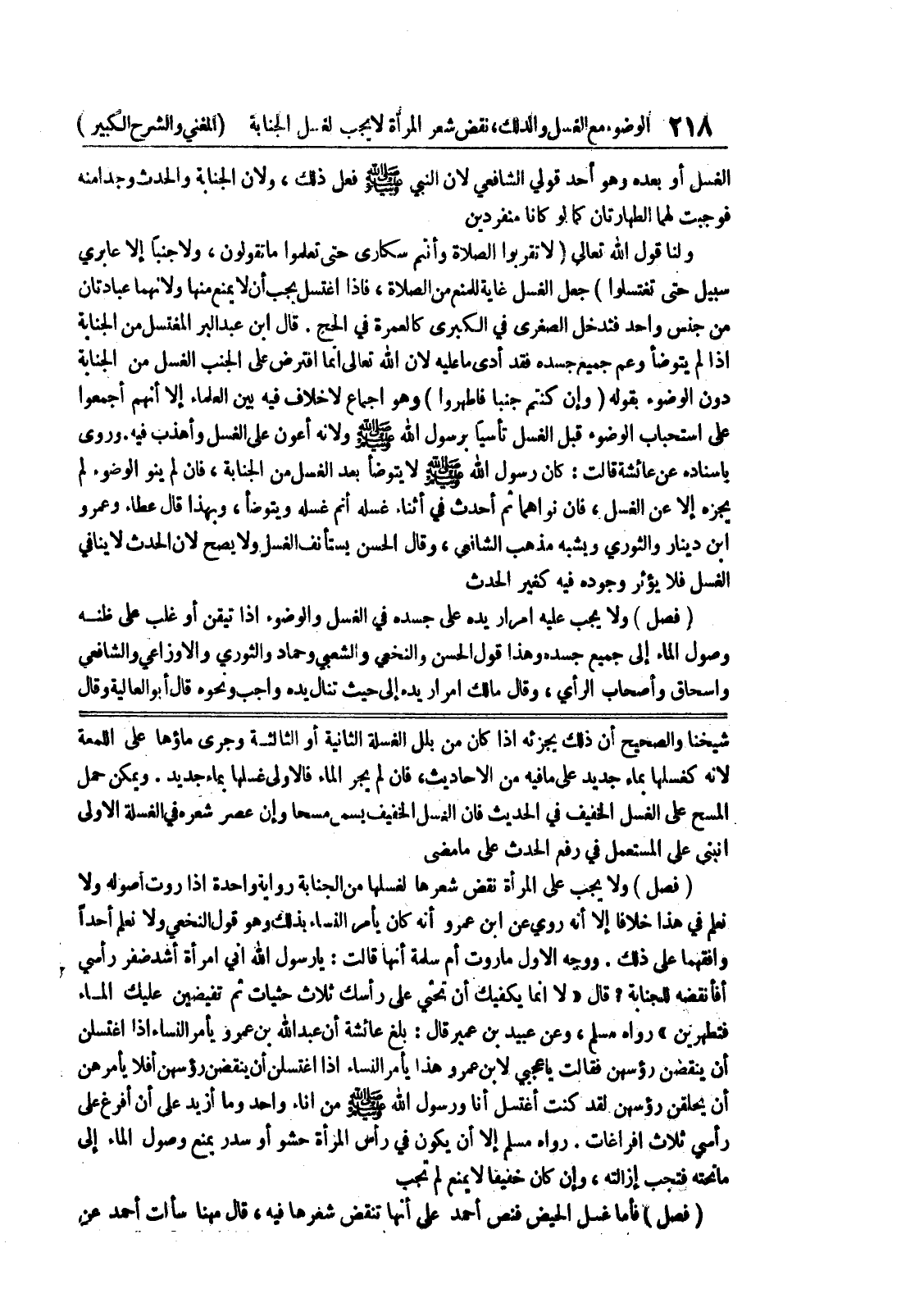 ووجه الأول ما روت ام سلمة أنها قالت: يا رسول الله إني امرأة أشد ضفر رأسي أفأنقضه للجنابة؟ قال " لا إنما يكفيك أن تحثي على رأسك ثلاث حثيات ثم تفيضين عليك الماء فتطهرين " رواه مسلم، وعن عبيد بن عمير قال: بلغ عائشة أن عبد الله بن عمرو يأمر النساء إذا اغتسلن أن ينقضن رؤسهن فقالت يا عجبي لابن عمرو هذا يأمر النساء إذا اغتسلن أن ينقضن رؤسهن أفلا يأمرهن أن يحلقن رؤسهن لقد كنت أغتسل أنا ورسول الله صلى الله عليه وسلم من إناء واحد وما أزيد على أن أفرغ على رأسي ثلاث إفراغات.
