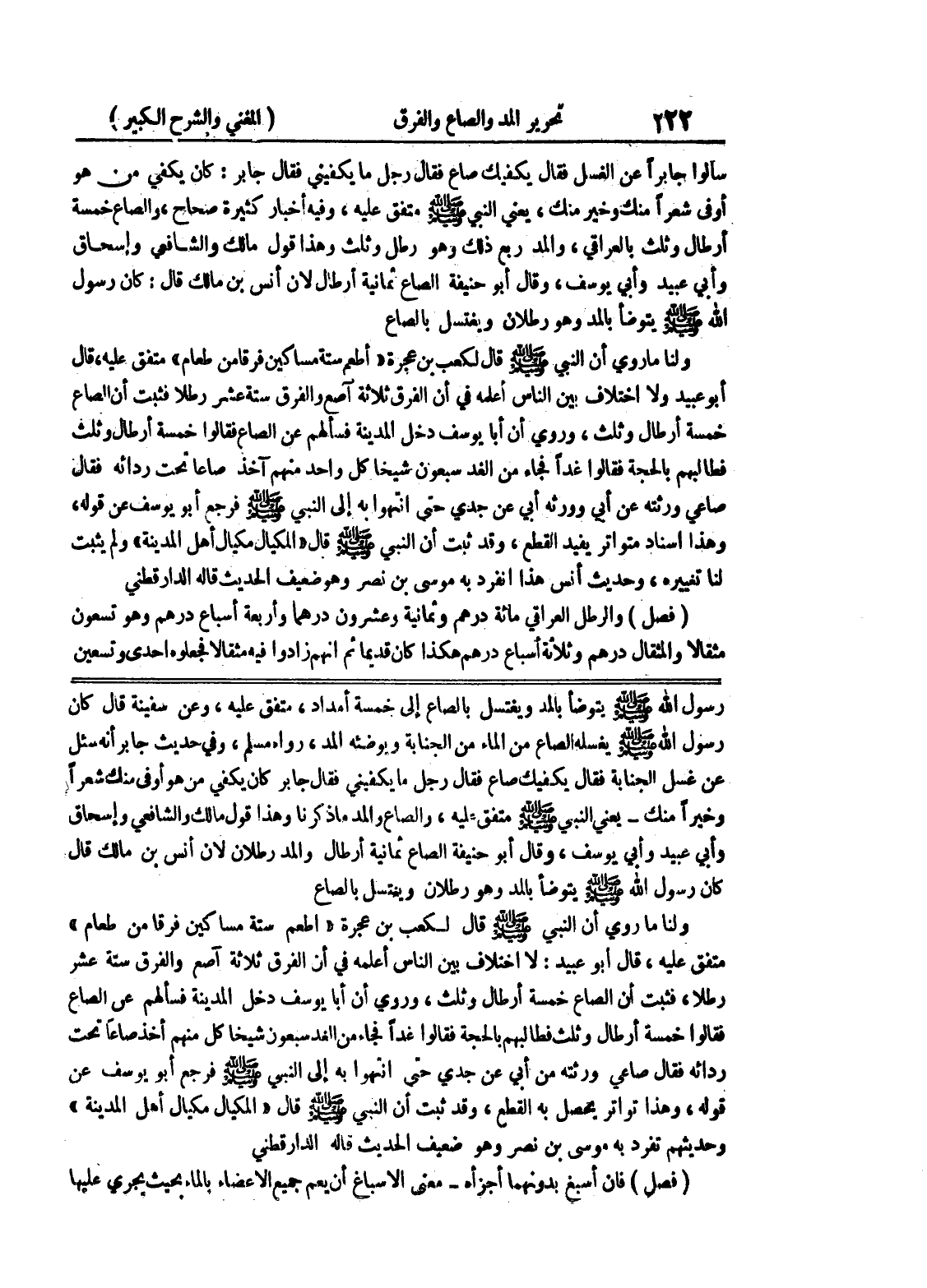 وخيراً منك - يعني النبي صلى الله عليه وسلم متفق عليه، والصاع والمد ما ذكرنا وهذا قول مالك والشافعي وإسحاق وأبي عبيد وأبي يوسف، وقال أبو حنيفة الصاع ثمانية أرطال والمد رطلان لان أنس بن مالك قال كان رسول الله صلى الله عليه وسلم يتوضأ بالمد وهو رطلان ويغتسل بالصاع ولنا ما روى أن النبي صلى الله عليه وسلم قال لكعب بن عجرة " اطعم ستة مساكين فرقا من طعام " متفق عليه، قال أبو عبيد: لا إختلاف بين الناس أعلمه في أن الفرق ثلاثة آصع والفرق ستة عشر رطلاً، فثبت أن الصاع خمسة أرطال وثلث، وروي أن أبا يوسف دخل المدينة فسألهم عن الصاع فقالوا خمسة أرطال وثلث فطالبهم بالحجة فقالوا غدافجاء من الغد سبعون شيخاً كل منهم أخذ صاعاً تحت ردائه فقال صاعي ورثته من أبي عن جدي حتى انتهوا به إلى النبي صلى الله عليه وسلم فرجع أبو يوسف عن قوله، وهذا تواتر يحصل به القطع، وقد ثبت أن النبي صلى الله عليه وسلم قال " المكيال مكيال أهل المدينة " وحديثهم تفرد به موسى بن نصر وهو ضعيف الحديث قاله الدارقطني (فصل) فإن أسبغ بدونهما أجزأه - معنى الإسباغ أن يعم جميع الأعضاء بالماء بحيث يجري عليها