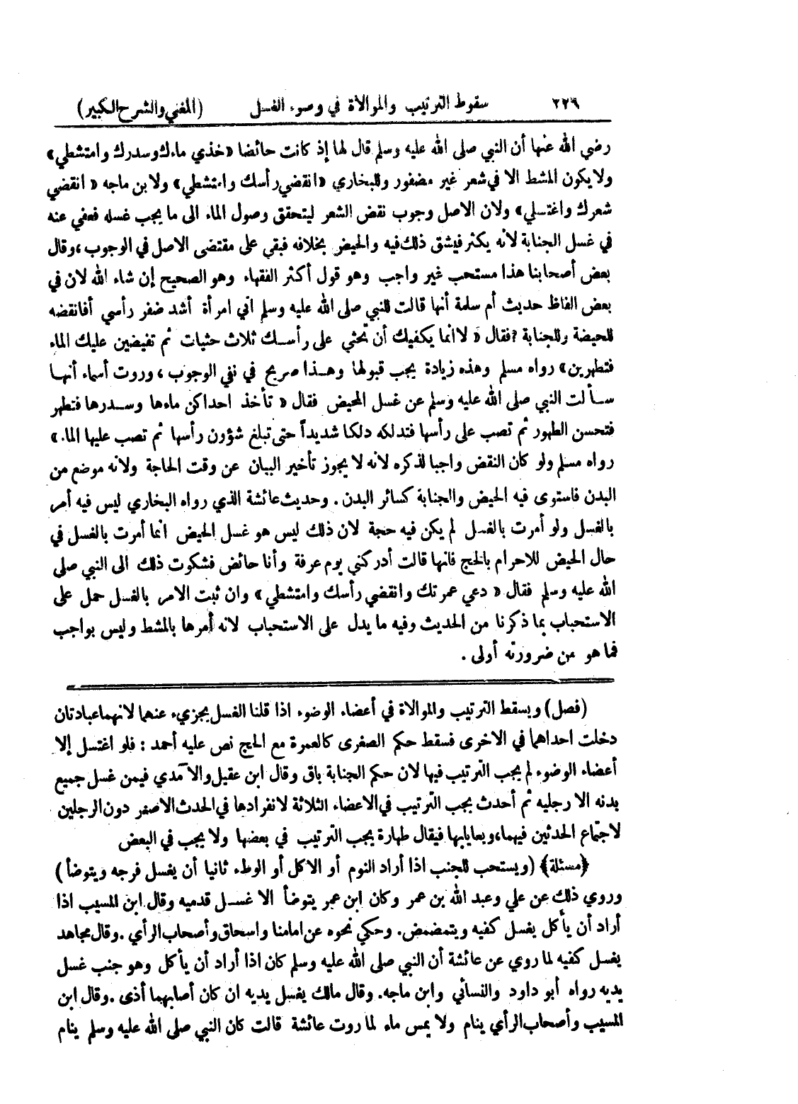 (فصل) ويسقط الترتيب والموالاة في أعضاء الوضوء إذا قلنا الغسل يجزئ عنهما لأنهما عبادتان دخلت إحداهما في الأخرى فسقط حكم الصغرى كالعمرة مع الحج نص عليه أحمد: فلو اغتسل إلا أعضاء الوضوء لم يجب الترتيب فيها لأن حكم الجنابة باق وقال ابن عقيل والآمدي فيمن غسل جميع بدنه إلا رجليه ثم أحدث يجب الترتيب في الأعضاء الثلاثة لانفرادها في الحدث الأصغر دون الرجلين لاجتماع الحدثين فيهما، ويعايابها فيقال طهارة يجب الترتيب في بعضها ولا يجب في البعض (مسألة) (ويستحب للجنب إذا أراد النوم أو الأكل أو الوطئ ثانياً أن يغسل فرجه ويتوضأ) وروي ذلك عن علي وعبد الله بن عمر وكان ابن عمر يتوضأ إلا غسل قدميه وقال ابن المسيب إذا أراد أن يأكل يغسل كفيه ويتمضمض.
