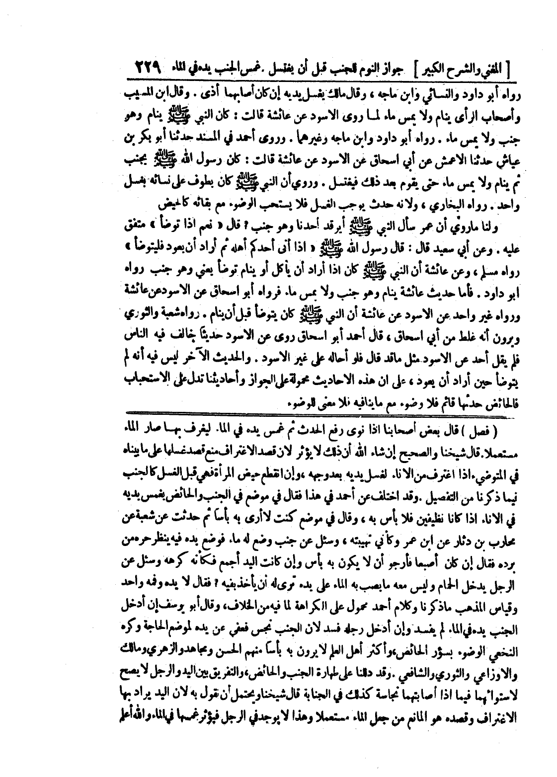 وقد اختلف عن أحمد في هذا فقال في موضع في الجنب والحائض يغمس يديه في الإناء إذا كانا نظيفين فلا بأس به، وقال في موضع كنت لا أرى به بأساً ثم حدثت عن شعبة عن محارب بن دثار عن ابن عمر وكأني تهيبته، وسئل عن جنب وضع له ماء فوضع يده فيه ينظر حرمه من برده فقال إن كان إصبعا فارجو أن لا يكون به بأس وإن كانت اليد أجمع فكأنه كرهه وسئل عن الرجل يدخل الحمام وليس معه ما يصب به الماء على يده ترى له أن يأخذ بفيه؟ فقال لا يده وفمه واحد وقياس المذهب ما ذكرنا وكلام أحمد محمول على الكراهة لما فيه من الخلاف، وقال أبو يوسف إن أدخل الجنب يده في الماء لم يفسد وإن أدخل رجله فسد لأن الجنب نجس فعفي عن يده لموضع الحاجة وكره النخعي الوضوء بسؤر الحائض، وأكثر أهل العلم لا يرون به بأسا منهم الحسن ومجاهد والزهري ومالك والاوزاعي والثوري والشافعي.
