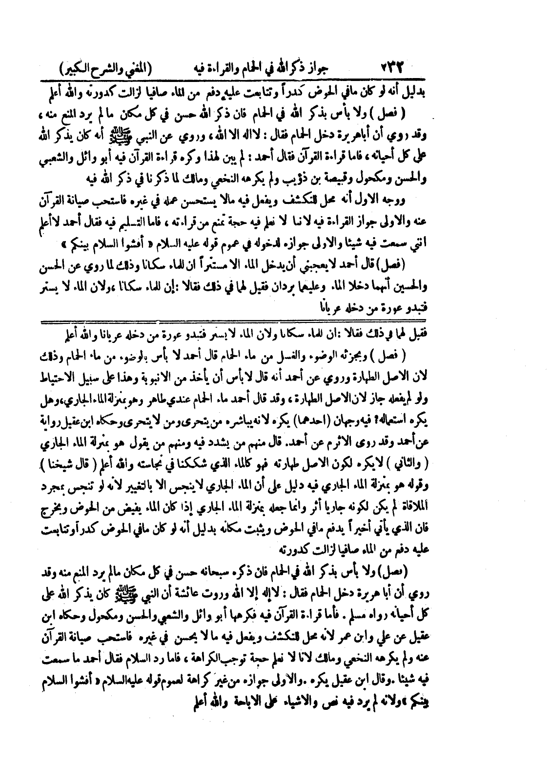 فقيل لهما في ذلك فقالا: إن للماء سكاناً ولأن الماء لا يستر فتبدو عورة من دخله عرياناً والله أعلم (فصل) ويجزئه الوضوء والغسل من ماء الحمام قال أحمد لا بأس بالوضوء من ماء الحمام وذلك لأن الأصل الطهارة وروى عن أحمد أنه قال لا بأس أن يأخذ من الأنبوبة وهذا على سبيل الاحتياط ولو لم يفعله جاز لأن الأصل الطهارة، وقد قال أحمد ماء لاحمام عندي طاهر وهو بمنزلة الماء الجاري، وهل يكره استعماله؟ فيه وجهان (أحدهما) يكره لأنه يباشره من يتحرى ومن لا يتحرى وحكاه ابن عقيل رواية