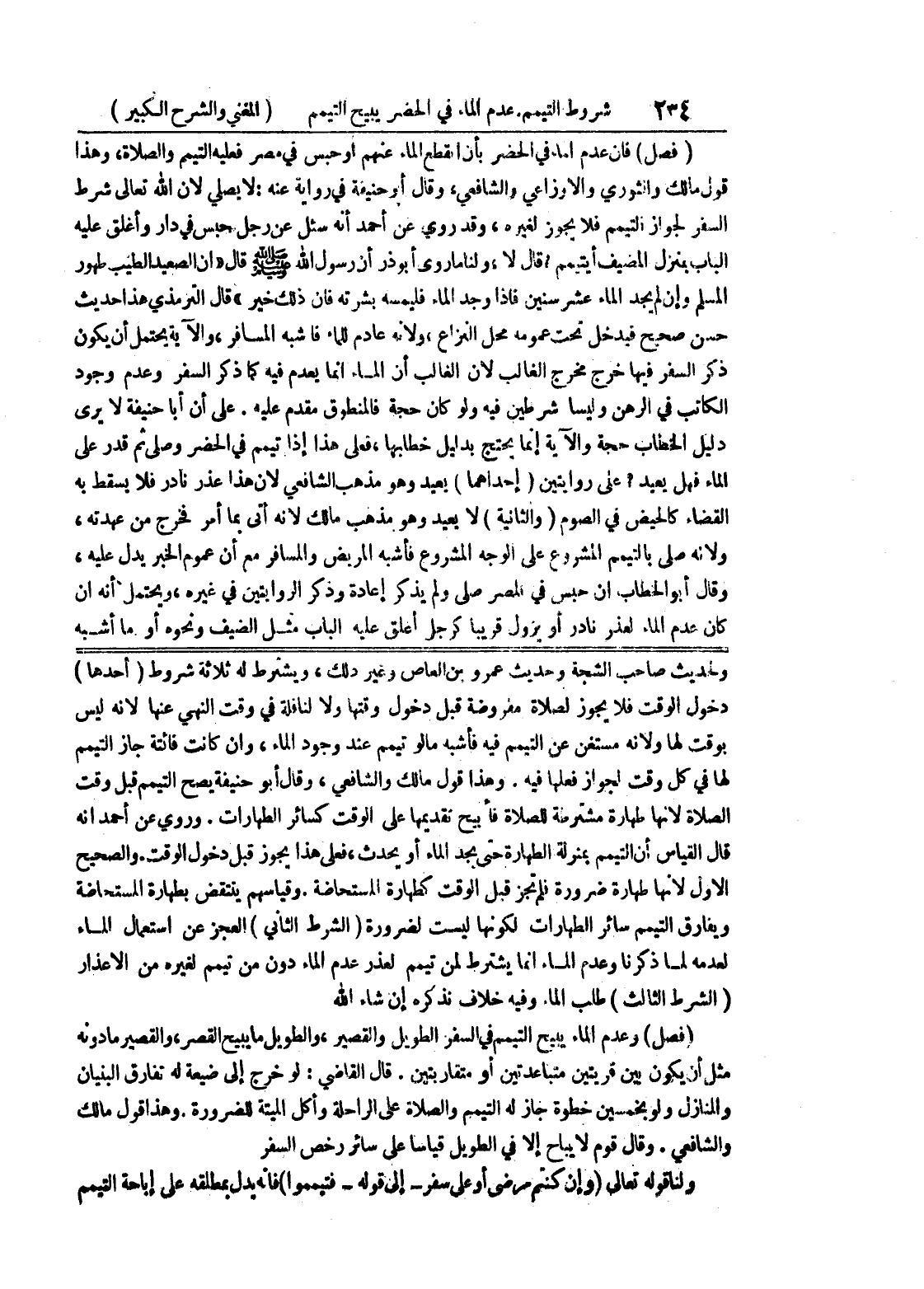 وقياسهم ينتقض بطهارة المستحاضة ويفارق التيمم سائر الطهارات لكونها ليست لضرورة (الشرط الثاني) العجز عن استعمال الماء لعدمه لما ذكرنا وعدم الماء إنما يشترط لمن تيمم لعذر عدم الماء دون من تيمم لغيره من الأعذار (الشرط الثالث) طلب الماء وفيه خلاف نذكره إن شاء الله (فصل) وعدم الماء يبيح التيمم في السفر الطويل والقصير، والطويل ما يبيح القصر، والقصير ما دونه مثل أن يكون بين قريتين متباعدتين أو متقاربتين.