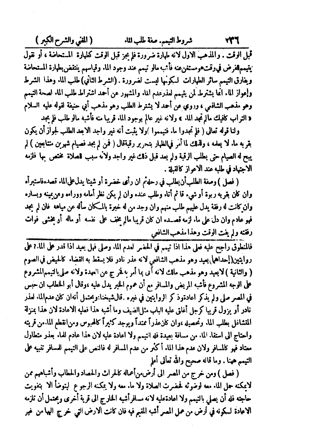 (فصل) ومن خرج من المصر إلى أرض من أعماله كالحراث والحصاد والحطاب وأشباههم ممن لا يمكنه حمل الماء معه لوضوئه فحضرت الصلاة ولا ماء معه ولا يمكنه الرجوع ليتوضأ إلا بتفويت حاجته فله أن يصلي بالتيمم ولا إعادة عليه لأنه مسافر أشبه الخارج إلى قرية اخرى ويحتمل أن تلزمه الإعادة لكونه في أرض من عمل المصر أشبه المقيم فيه فإن كانت الأرض التي خرج إليها من غير