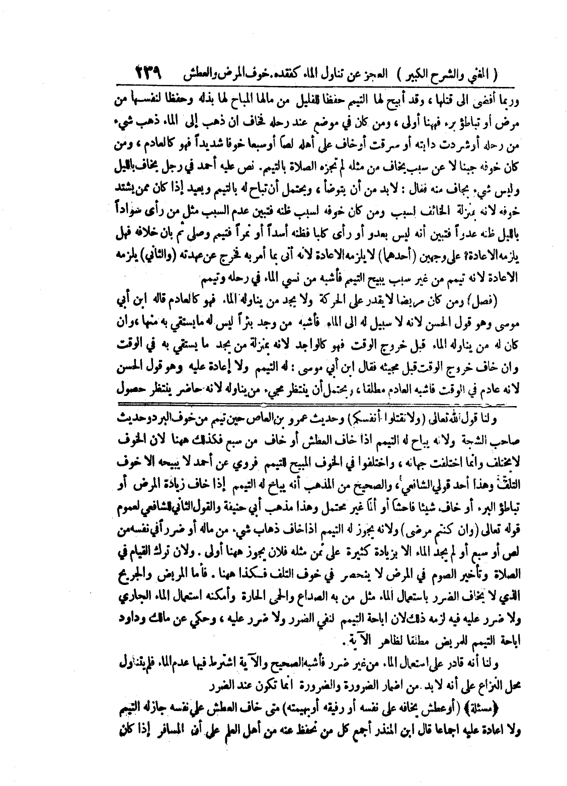 ولنا أنه قادر على استعمال الماء من غير ضرر فأشبه الصحيح والآية اشترط فيها عدم الماء فلم يتناول محل النزاع على أنه لابد من إضمار الضرورة والضرورة إنما تكون عند الضرر (مسألة) (أو عطش يخافه على نفسه أو رفيقه أو بهيمته) متى خاف العطش على نفسه جاز له التيمم ولا إعادة عليه إجماعاً قال إبن المنذر أجمع كل من نحفظ عنه من أهل العلم على أن المسافر إذا كان