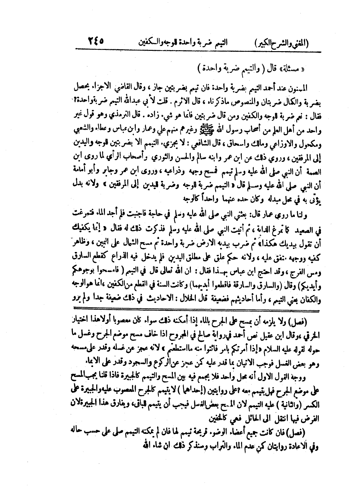 (فصل) ولا يلزمه أن يمسح على الجرح بالماء إذا أمكنه ذلك سواء كان معصوباً أو لا هذا اختيار الخرقي، وقال ابن عقيل نص أحمد في رواية صالح في المجروح إذا خاف مسح موضع الجرح وغسل ما حوله لقوله عليه السلام " إذا أمرتكم بأمر فائتوا منه ما استطعتم " لأنه عجز عن غسله وقدر على مسحه وهو بعض الغسل فوجب الإتيان بما قدر عليه كمن عجز عن الركوع والسجود وقدر على الإيماء ووجه القول الأول أنه محل واحد فلا يجمع فيه بين المسح والتيمم كالجبيرة فإذا قلنا يجب المسح على موضع الجرح فهل يتيمم معه؟ على روايتين (إحداهما) لا يتيمم كالجرح المعصوب عليه والجبيرة على الكسر (والثانية) عليه التيمم لأن المسح بعض الغسل فيجب أن يتيمم للباقي، ويفارق هذا الجبيرة لأن الفرض فيها انتقل إلى الحائل فهي كالخفين (فصل) فإن كانت جميع أعضاء الوضوء قريحة تيمم لها فان لم يمكنه التيمم صلى على حسب حاله وفي الإعادة روايتان كمن عدم الماء والتراب وسنذكر ذلك إن شاء الله