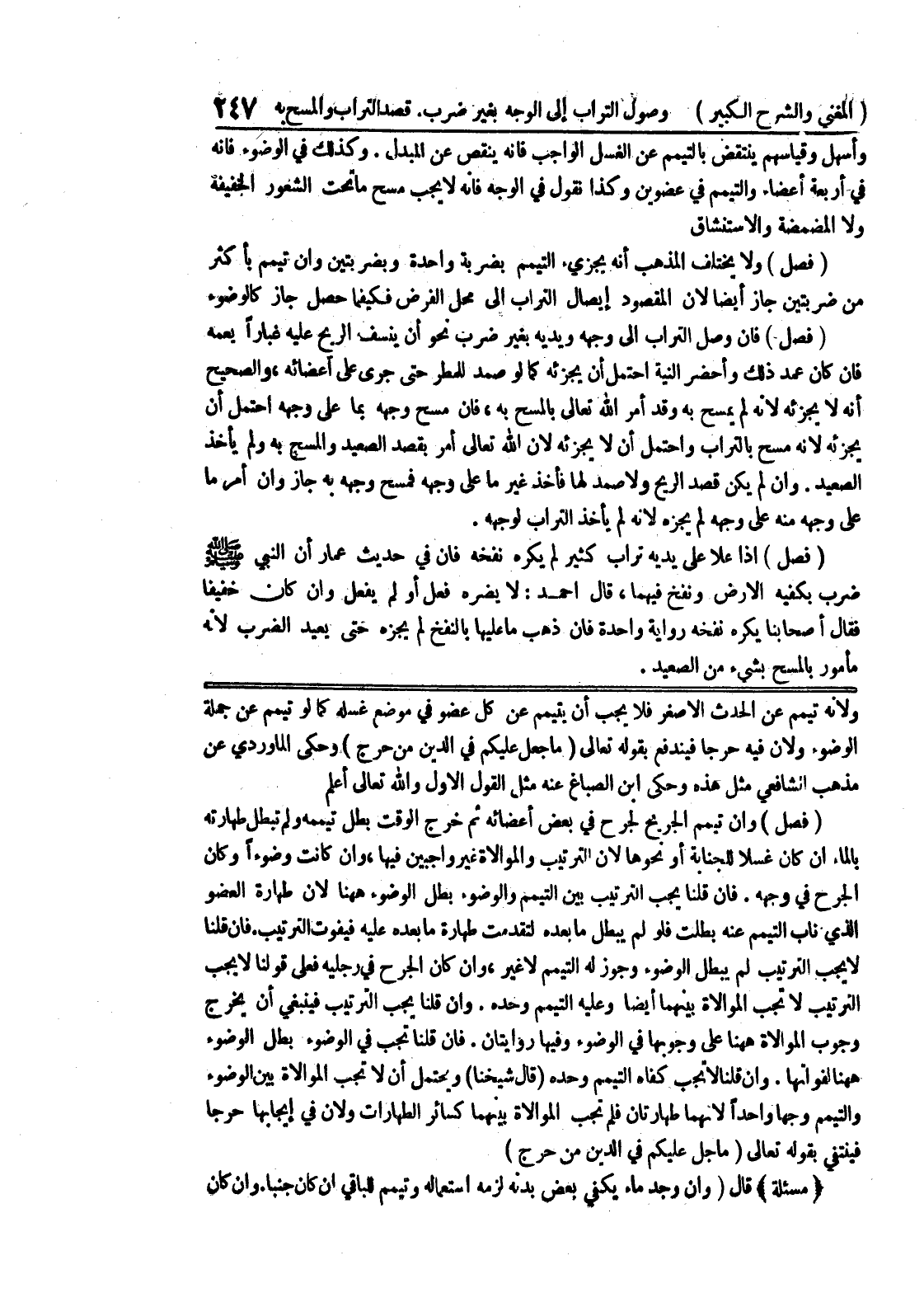 ولأنه تيمم عن الحدث الأصغر فلا يجب أن يتيمم عن كل عضو في موضع غسله كما لو تيمم عن جملة الوضوء ولأن فيه حرجاً فيندفع بقوله تعالى (ما جعل عليكم في الدين من حرج) وحكى الماوردي عن مذهب الشافعي مثل هذه وحكي ابن الصباغ عنه مثل القول الأول والله تعالى أعلم (فصل) وإن تيمم الجريح لجرح في بعض أعضائه ثم خرج الوقت بطل تيممه ولم تبطل طهارته بالماء إن كان غسلاً للجنابة أو نحوها لأن الترتيب والموالاة غير واجبين فيها، وإن كانت وضوءاً وكان الجرح في وجهه.