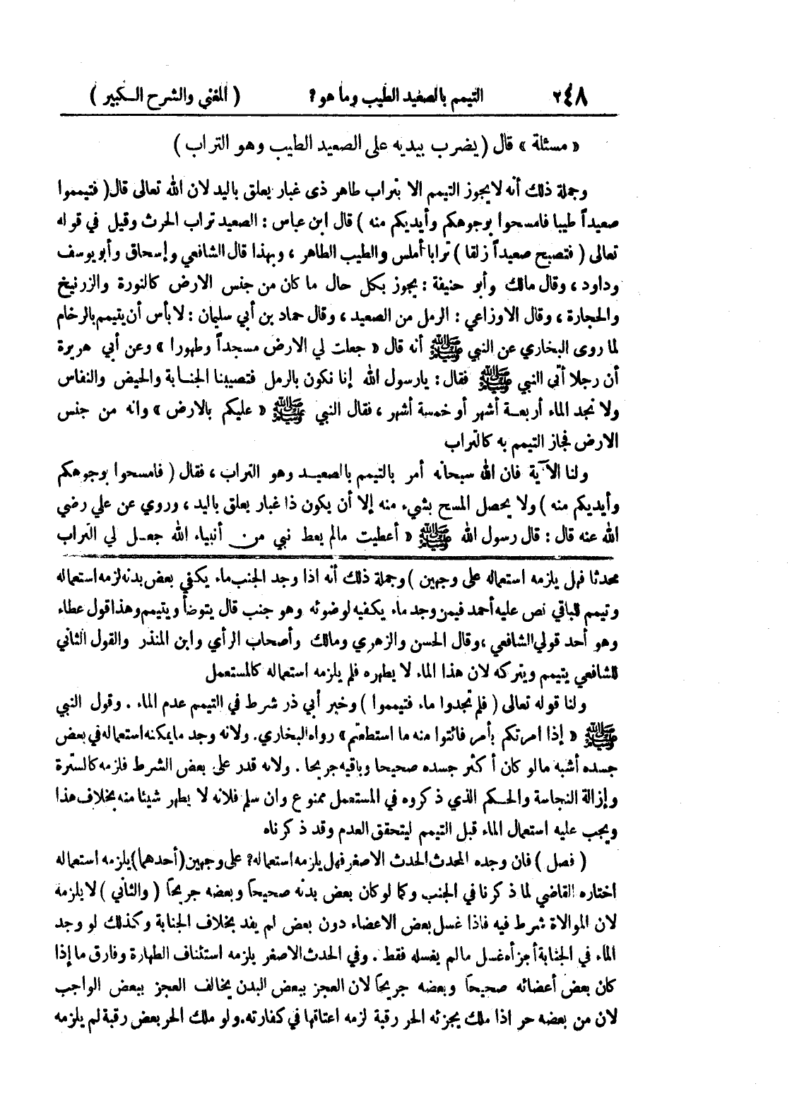 محدثاً فهل يلزمه استعماله على وجهين) وجملة ذلك أنه إذا وجد الجنب ماء يكفي بعض بدنه لزمه إستعماله وتيمم للباقي نص عليه أحمد فيمن وجد ماء يكفيه لوضوئه وهو جنب قال يتوضأ ويتيمم وهذا قول عطاء وهو أحد قولي الشافعي، وقال الحسن والزهري ومالك وأصحاب الرأي وابن المنذر والقول الثاني للشافعي يتيمم ويتركه لأن هذا الماء لا يطهره فلم يلزمه استعماله كالمستعمل ولنا قوله تعالى (فلم تجدوا ماء فتيمموا) وخبر أبي ذر شرط في التيمم عدم الماء.