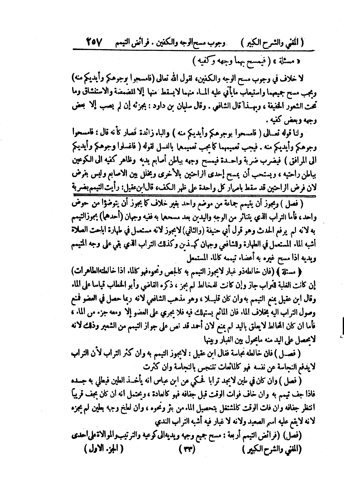 (فصل) ويجوز أن يتيمم جماعة من موضع واحد بغير خلاف كما يجوز أن يتوضؤا من حوض واحد، فأما التراب الذي يتناثر من الوجه واليدين بعد مسحهما به ففيه وجهان (أحدهما) يجوز التيمم به لأنه لم يرفع الحدث وهو قول أبي حنيفة (والثاني) لا يجوز لأنه مستعمل في طهارة أباحت الصلاة أشبه الماء المستعمل في الطهارة وللشافعي وجهان كهذين وكذلك التراب الذي بقي على وجه المتيمم ويديه إذا مسح غيره به أعضاء تيممه كالماء المستعمل (مسألة) (فإن خالطه ذو غبار لا يجوز التيمم به كالجص ونحوه فهو كالماء إذا خالطته الطاهرات) إن كانت الغلبة للتراب جاز وإن كانت للمخالط لم يجز، ذكره القاضي وأبو الخطاب قياساً على الماء وقال ابن عقيل يمنع التيمم به وإن كان قليلاً، وهو مذهب الشافعي لأنه ربما حصل في العضو فمنع وصول التراب إليه بخلاف الماء فإن المائع يستهلك فيه فلا يجري على العضو إلا ومعه جزء من الماء، فأما إن كان المخالط لا يعلق باليد لم يمنع لأن أحمد قد نص على جواز التيمم من الشعير وذلك لأنه لا يحصل على اليد منه بما يحول بين الغبار وبينها (فصل) فإن خالطه نجاسة فقال ابن عقيل: لا يجوز التيمم به وإن كثر التراب لأن التراب لا يدفع النجاسة عن نفسه فهو كالمائعات تتنجس بالنجاسة وإن كثرت