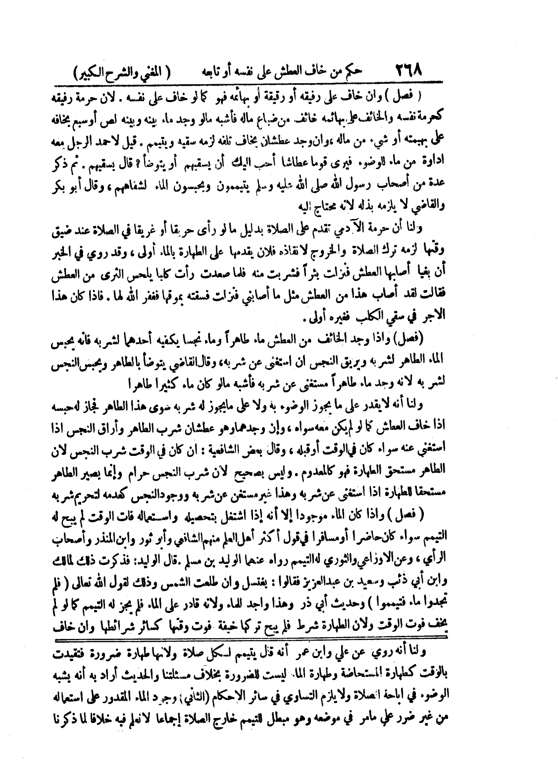 ولنا أنه روي عن علي وابن عمر أنه قال يتيمم لكل صلاة ولأنها طهارة ضرورة فتقيدت بالوقت كطهارة المستحاضة وطهارة الماء ليست للضرورة بخلاف مسئلتنا والحديث أراد به أنه يشبه الوضوء في إباحة الصلاة ولا يلزم التساوي في سائر الأحكام (الثاني) وجود الماء المقدور على استعماله من غير ضرر على ما مر في موضعه وهو مبطل للتيمم خارج الصلاة إجماعاً لا نعلم فيه خلافاً لما ذكرنا