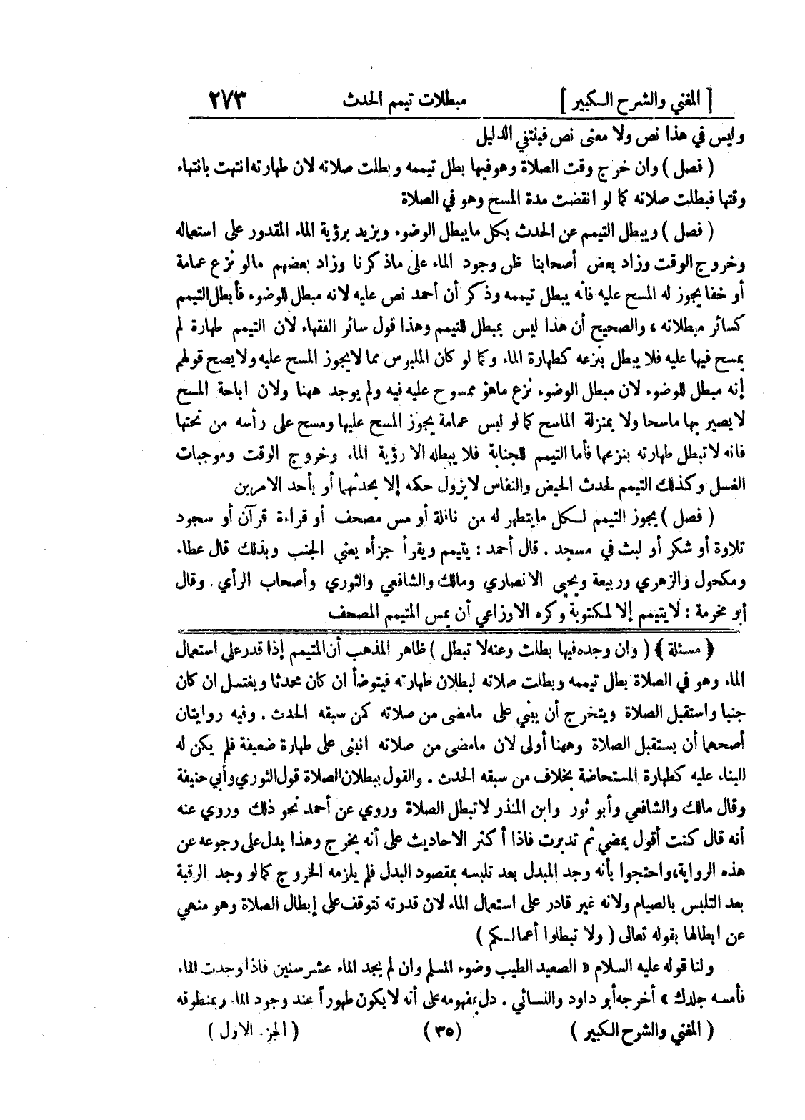 (مسألة) (وإن وجده فيها بطلت وعنه لا تبطل) ظاهر المذهب أن المتيمم إذا قدر على استعمال الماء وهو في الصلاة بطل تيممه وبطلت صلاته لبطلان طهارته فيتوضأ إن كان محدثاً ويغتسل إن كان جنباً واستقبل الصلاة ويتخرج أن يبني على ما مضى من صلاته كمن سبقه الحدث.