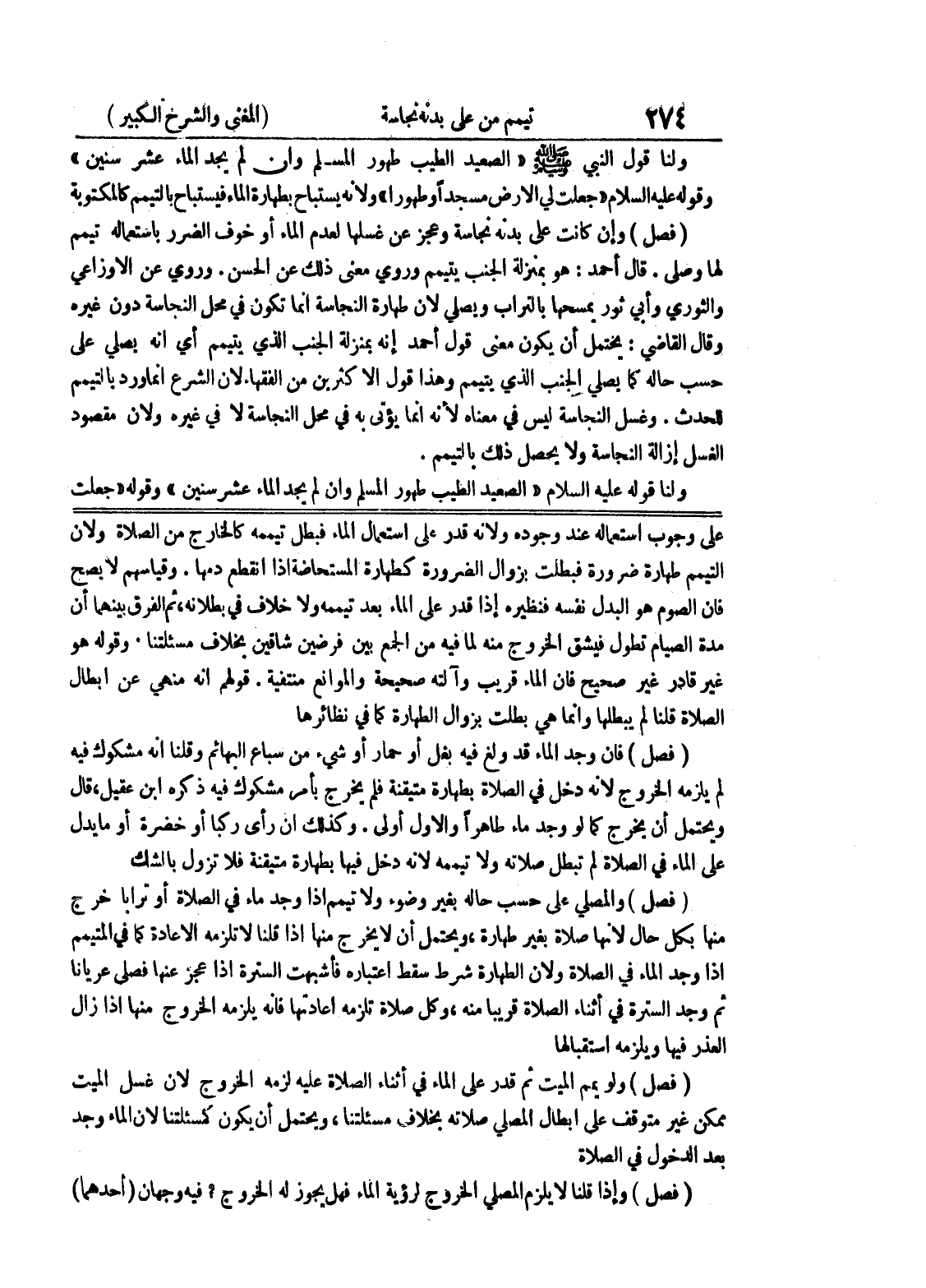 وكذلك إن رأى ركباً أو خضرة أو ما يدل على الماء في الصلاة لم تبطل صلاته ولا تيممه لأنه دخل فيها بطهارة متيقنة فلا تزول بالشك (فصل) والمصلي على حسب حاله بغير وضوء ولا تيمم إذا وجد ماء في الصلاة أو تراباً خرج منها بكل حال لأنها صلاة بغير طهارة، ويحتمل أن لا يخرج منها إذا قلنا لا تلزمه الإعادة كما في المتيمم إذا وجد الماء في الصلاة ولأن الطهارة شرط سقط إعتباره فأشبهت السترة إذا عجز عنها فصلى عرياناً ثم وجد السترة في أثناء الصلاة قريباً منه، وكل صلاة تلزمه إعادتها فإنه يلزمه الخروج منها إذا زال العذر فيها ويلزمه إستقبالها (فصل) ولو يمم الميت ثم قدر على الماء في أثناء الصلاة عليه لزمه الخروج لأن غسل الميت ممكن غير متوقف على إبطال المصلي صلاته بخلاف مسئلتنا، ويحتمل أن يكون كمسئلتنا لأن الماء وجد بعد الدخول في الصلاة