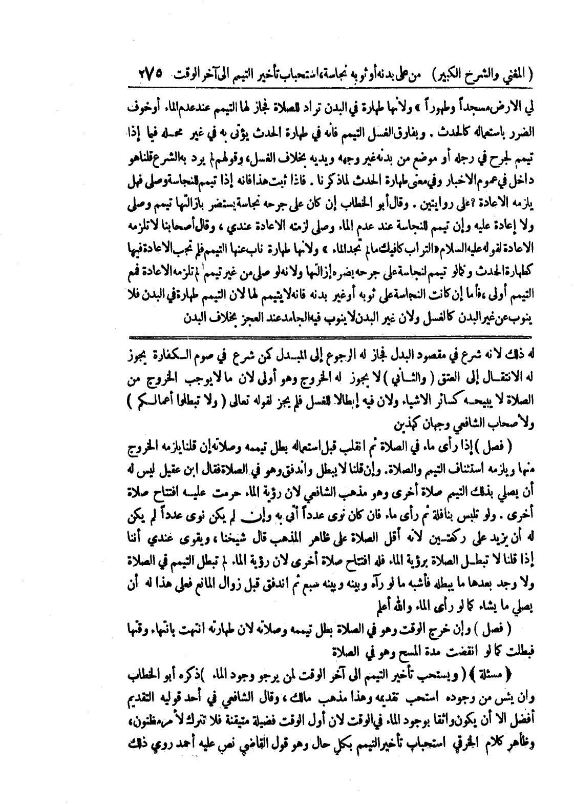 ولو تلبس بنافلة ثم رأى ماء فإن كان نوى عدداً أتى به وإن لم يكن نوى عدداً لم يكن له أن يزيد على ركعتين لأنه أقل الصلاة على ظاهر المذهب قال شيخنا، ويقوى عندي أننا إذا قلنا لا تبطل الصلاة برؤية الماء فله إفتتاح صلاة أخرى لأن رؤية الماء لم تبطل التيمم في الصلاة ولا وجد بعدها ما يبطله فأشبه ما لو رآه وبينه وبينه سبع ثم اندفق قبل زوال المانع فعلى هذا له أن يصلي ما يشاء كما لو رأى الماء والله أعلم (فصل) وإن خرج الوقت وهو في الصلاة بطل تيممه وصلاته لأن طهارته انتهت بانتهاء وقتها فبطلت كما لو انقضت مدة المسح وهو في الصلاة (مسألة) (ويستحب تأخير التيمم إلى آخر الوقت لمن يرجو وجود الماء) ذكره أبو الخطاب وإن يئس من وجوده استحب تقديمه وهذا مذهب مالك، وقال الشافعي في أحد قوليه التقديم أفضل إلا أن يكون واثقاً بوجود الماء في الوقت لان أول الوقت فضيلة متيقنة فلا تترك لأمر مظنون، وظاهر كلام الخرقي إستحباب تأخير التيمم بكل حال وهو قول القاضي نص عليه أحمد روى ذلك