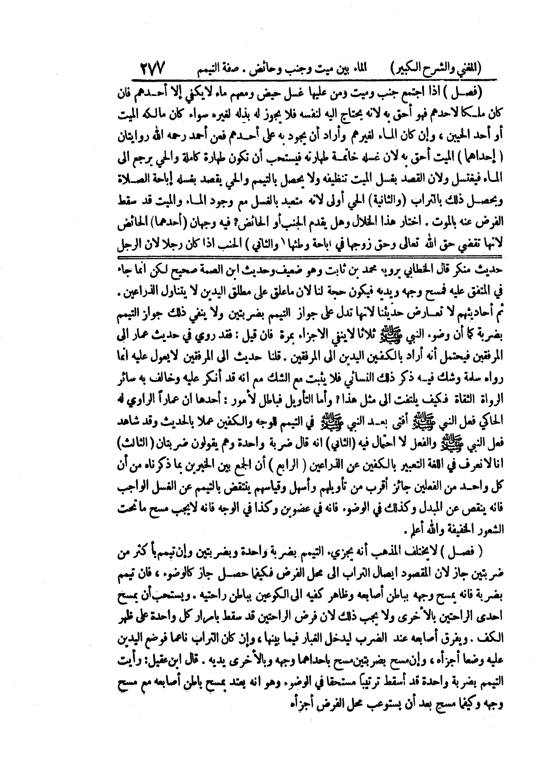 قلنا حيث إلى المرفقين لا يعول عليه إنما رواه سلمة وشك فيه ذكر ذلك النسائي فلا يثبت مع الشك مع أنه قد أنكر عليه وخالف به سائر الرواة الثقاة فكيف يلتفت إلى مثل هذا؟ وأما التأويل فباطل لأمور: أحدها أن عماراً الراوي له الحاكي فعل النبي صلى الله عليه وسلم أفتى بعد النبي صلى الله عليه وسلم في التيمم للوجه والكفين عملاً بالحديث وقد شاهد فعل النبي صلى الله عليه وسلم والفعل لا احتمال فيه (الثاني) أنه قال ضربة واحدة وهم يقولون ضربتان (الثالث) أنا لا نعرف في اللغة التعبير بالكفين عن الذراعين (الرابع) أن الجمع بين الخبرين بما ذكرناه من أن كل واحد من الفعلين جائز أقرب من تأويلهم وأسهل وقياسهم ينتقض بالتيمم عن الغسل الواجب فإنه ينقص عن المبدل وكذلك في الوضوء فإنه في عضوين وكذا في الوجه فإنه لا يجب مسح ما تحت الشعور الخفيفة والله أعلم.