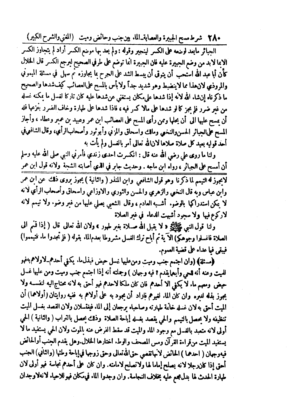 للميت وعنه أنه للحي وأيهما يقدم؟ فيه وجهان) وجملته أنه إذا إجتمع جنب وميت ومن عليها غسل حيض ومعهم ماء لا يكفي إلا أحدهم فإن كان ملكاً لأحدهم فهو أحق به لأنه محتاج إليه لنفسه ولا يجوز بذله لغيره وإن كان الماء لغيرهم فأراد أن يجود به على أولاهم به ففيه روايتان (أولاهما) إن الميت أحق به لأن غسله خاتمة طهارته وصاحباه يرجعان إلى الماء فيغتسلان ولان لاقصد بغسل الميت تنظيفه ولا يحصل بالتيمم والحي يقصد بغسله إباحة الصلاة وذلك يحصل بالتراب (والثانية) الحي أولى لأنه متعبد بالغسل مع وجود الماء والميت قد سقط الفرض عنه بالموت ولأن الحي يستفيد مالا يستفيد الميت من قراءة القرآن ومس المصحف والوطئ إختارها الخلال.