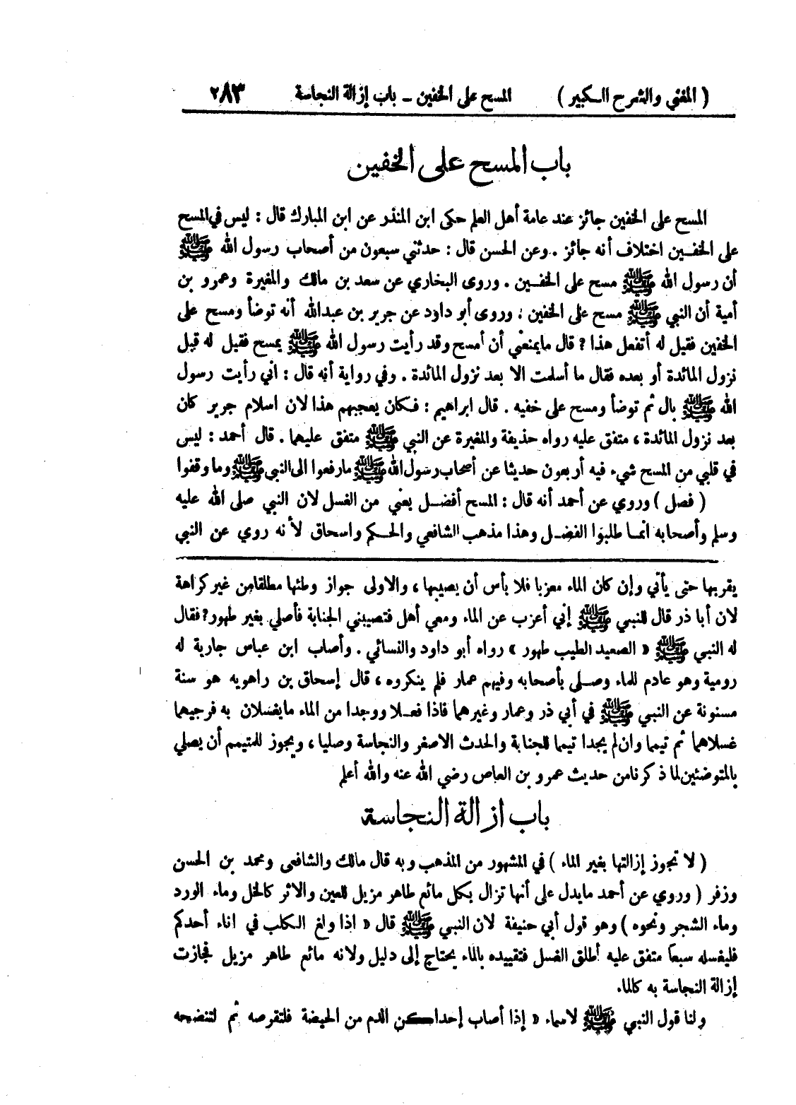 وأصاب ابن عباس جارية له رومية وهو عادم للماء وصلى بأصحابه وفيهم عمار فلم ينكروه، قال اسحاق بن راهويه هو سنة مسنونة عن النبي صلى الله عليه وسلم في أبي ذر وعمار وغيرهما فإذا فعلا ووجدا من الماء ما يغسلان به فرجيهما غسلاهما ثم تيمما وإن لم يجدا تيمماً للجنابة والحدث الاصغر والنجاسة وصليا، ويجوز للمتيمم أن يصلي بالمتوضئين لما ذكرنا من حديث عمرو بن العاص رضي الله عنه والله أعلم باب إزالة النجاسة (لا تجوز إزالتها بغير الماء) في المصهور من المذهب وبه قال مالك والشافعي ومحمد بن الحسن وزفر (وروى عن أحمد ما يدل على أنها تزال بكل مائع طاهر مزيل للعين والأثر كالخل وماء الورد وماء الشجر ونحوه) وهو قول أبي حنيفة لأن النبي صلى الله عليه وسلم قال " إذا ولغ الكلب في إناء أحدكم فليغسله سبعاً متفق عليه أطلق الغسل فتقييده بالماء يحتاج إلى دليل ولانه مائع طاهر مزيل فجازت إزالة النجاسة به كالماء ولنا قول النبي صلى الله عليه وسلم لاسماء " إذا أصاب إحداكن الدم من الحيضة فلتقرصه ثم لتنضحه