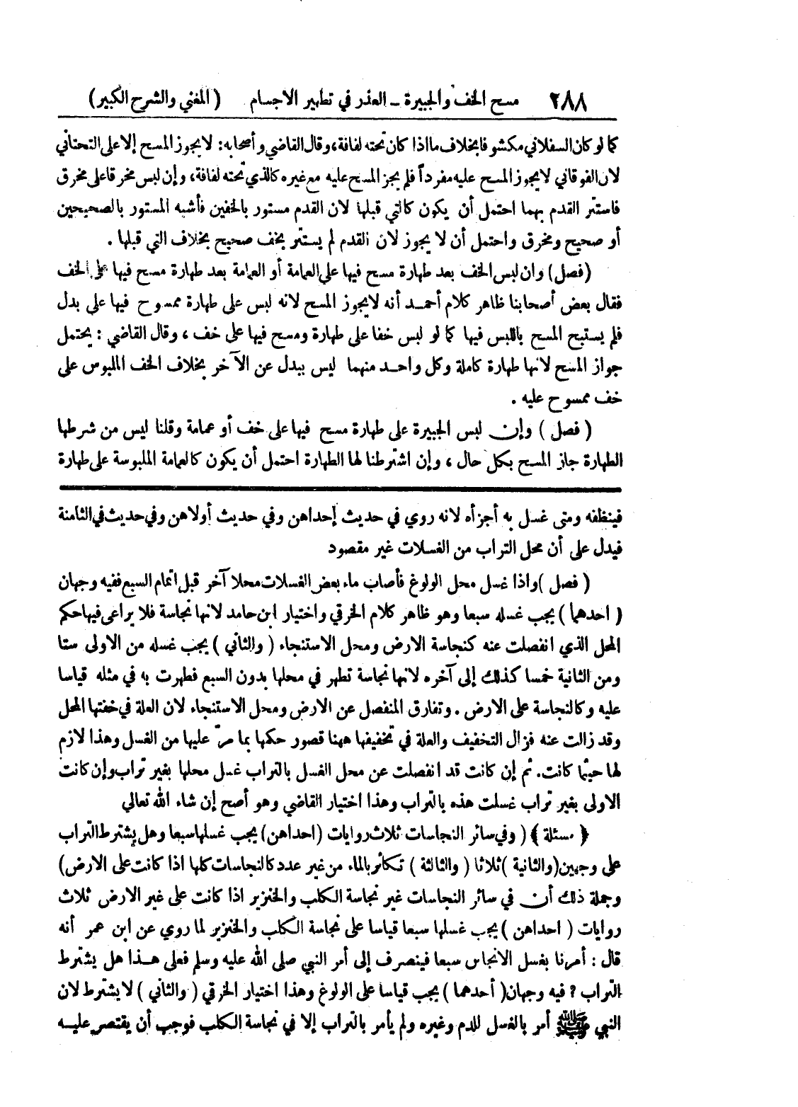 ثم إن كانت قد انفصلت عن محل الغسل بالتراب غسل محلها بغير تراب وإن كانت الأولى بغير تراب غسلت هذه بالتراب وهذا اختيار القاضي وهو أصح إن شاء الله تعالى (مسألة) (وفي سائر النجاسات ثلاث روايات (إحداهن) يجب غسلها سبعاً وهل يشترط التراب على وجهين (والثانية) ثلاثا (والثالثة) تكاثر بالماء من غير عدد كالنجاسات كلها إذا كانت على الأرض) وجملة ذلك أن في سائر النجاسات غير نجاسة الكلب والخنزير إذا كانت على غير الأرض ثلاث روايات (إحداهن) يجب غسلها سبعاً قياساً على نجاسة الكلب والخنزير لما روي عن ابن عمر أنه قال: أمرنا بغسل الأنجاس سبعاً فينصرف إلى أمر النبي صلى الله عليه وسلم فعلى هذا هل يشترط التراب؟ فيه وجهان (أحدهما) يجب قياسا على الولوغ وهذا اختيار الخرقي (والثاني) لا يشترط لأن النبي صلى الله عليه وسلم أمر بالغسل للدم وغيره ولم يأمر بالتراب إلا في نجاسة الكلب فوجب أن يقتصر عليه