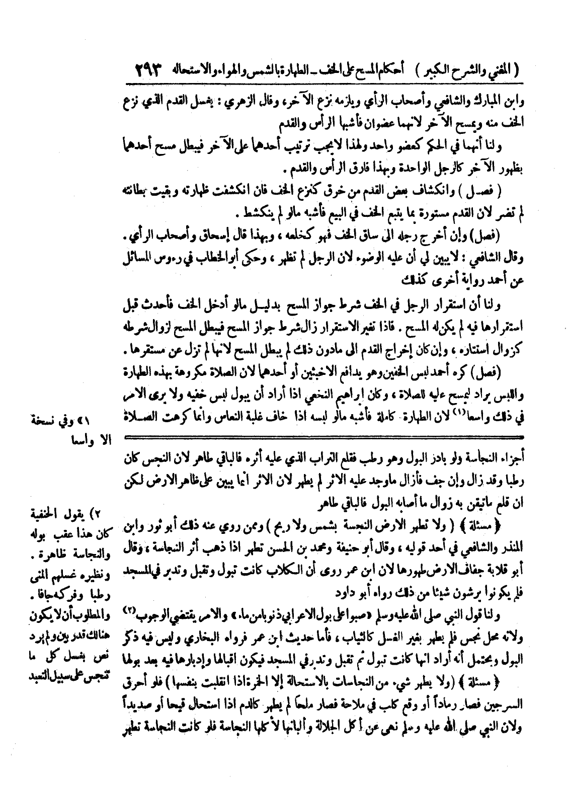 ولنا قول النبي صلى الله عليه وسلم " صبوا على بول الأعرابي ذنوبا من ماء " والأمر يقتضي الوجوب (2) ولأنه محل نجس فلم يطهر بغير الغسل كالثياب، فأما حديث ابن عمر فرواه البخاري وليس فيه ذكر البول ويحتمل أنه أراد أنها كانت تبول ثم تقبل وتدبر في المسجد فيكون إقبالها وإدبارها فيه بعد بولها (مسألة) (ولا يطهر شئ من النجاسات بالإستحالة إلا الخمرة إذا انقلبت بنفسها) فلو أحرق السرجين فصار رماداً أو وقع كلب في ملاحة فصار ملحاً لم يطهر كالدم إذا استحال قيحاً أو صديداً ولأن النبي صلى الله عليه وسلم نهى عن أكل الجلالة وألبانها لأكلها النجاسة فلو كانت النجاسة تطهر