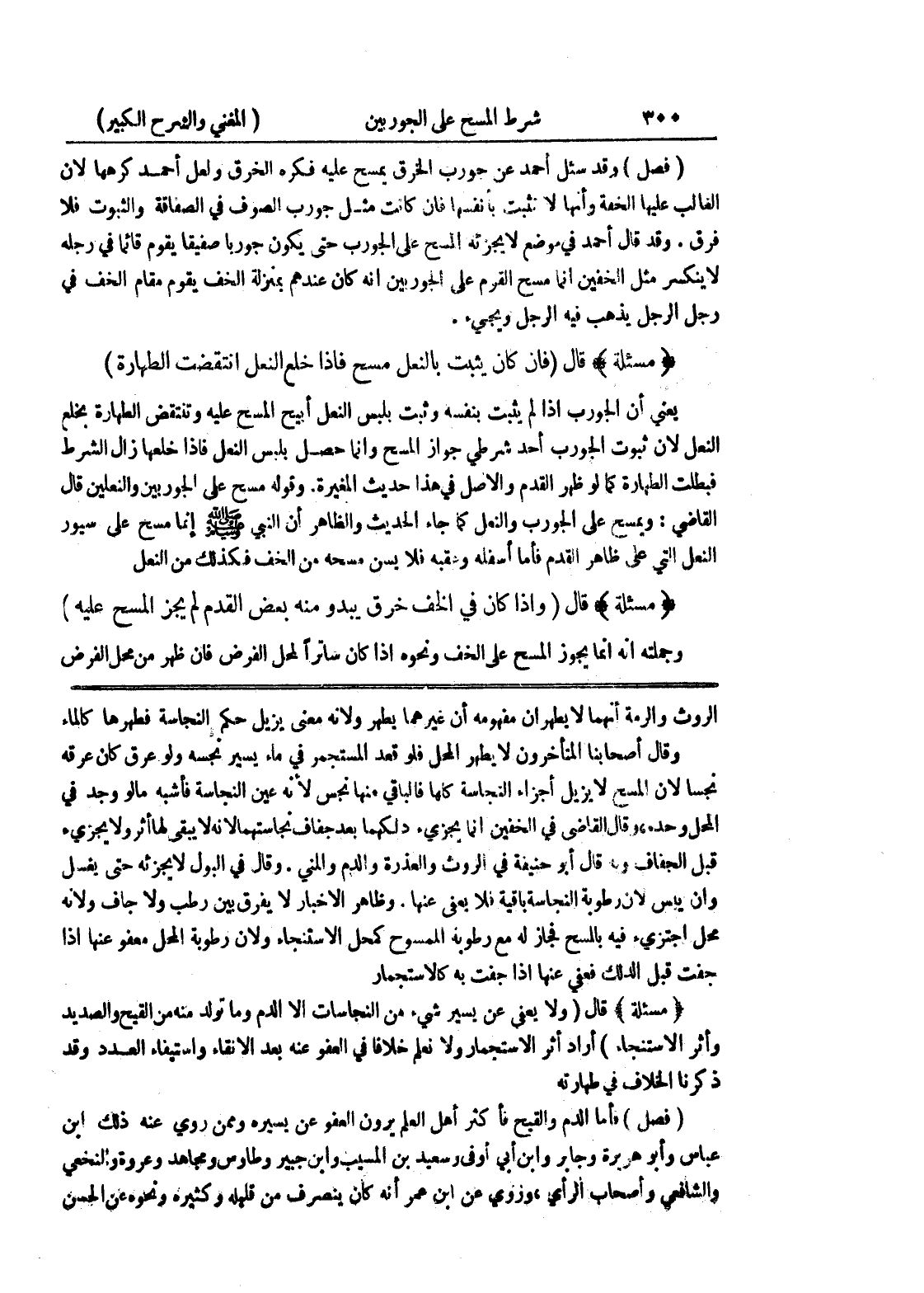 جفت قبل الدلك فعفي عنها إذا جفت به كالاستجمار (مسألة) قال (ولا يعفى عن يسير شئ من النجاسات إلا الدم وما تولد منه من القيح والصديد وأثر الاستنجاء) أراد أثر الاستجمار ولا نعلم خلافاً في العفو عنه بعد الإنقاء واستيفاء العدد وقد ذكرنا الخلاف في طهارته (فصل) فأما الدم والقيح فأكثر أهل العلم يرون العفو عن يسيره وممن روي عنه ذلك ابن عباس وأبو هريرة وجابر وابن أبي أوفى وسعيد بن المسيب وابن جبير وطاوس ومجاهد وعروة والنخعي والشافعي وأصحاب الرأي، وروي عن ابن عمر أنه كان ينصرف من قليله وكثيره ونحوه عن الحسن