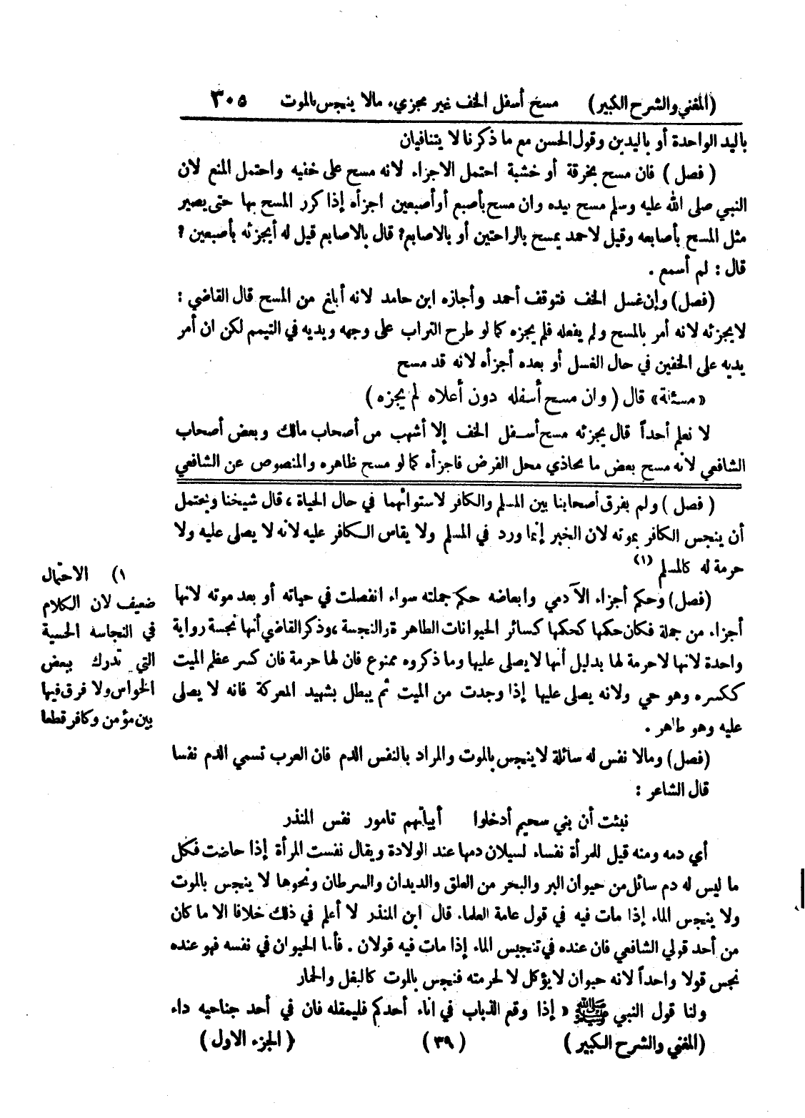 (فصل) وما لا نفس له سائلة لا ينجس بالموت والمراد بالنفس الدم فإن العرب تسمي الدم نفساً قال الشاعر: نبئت أن بني سحيم أدخلوا * أبياتهم تامور نفس المنذر أي دمه ومنه قيل للمرأة نفساء لسيلان دمها عند الولادة ويقال نفست المرأة إذا حاضت فكل ما ليس له دم سائل من حيوان البر والبحر من العلق والديدان والسرطان ونحوها لا ينجس بالموت ولا ينجس الماء إذا مات فيه في قول عامة العلماء قال إبن المنذر لا أعلم في ذلك خلافاً إلا ما كان من أحد قولي الشافعي فإن عنده في تنجيس الماء إذا مات فيه قولان.